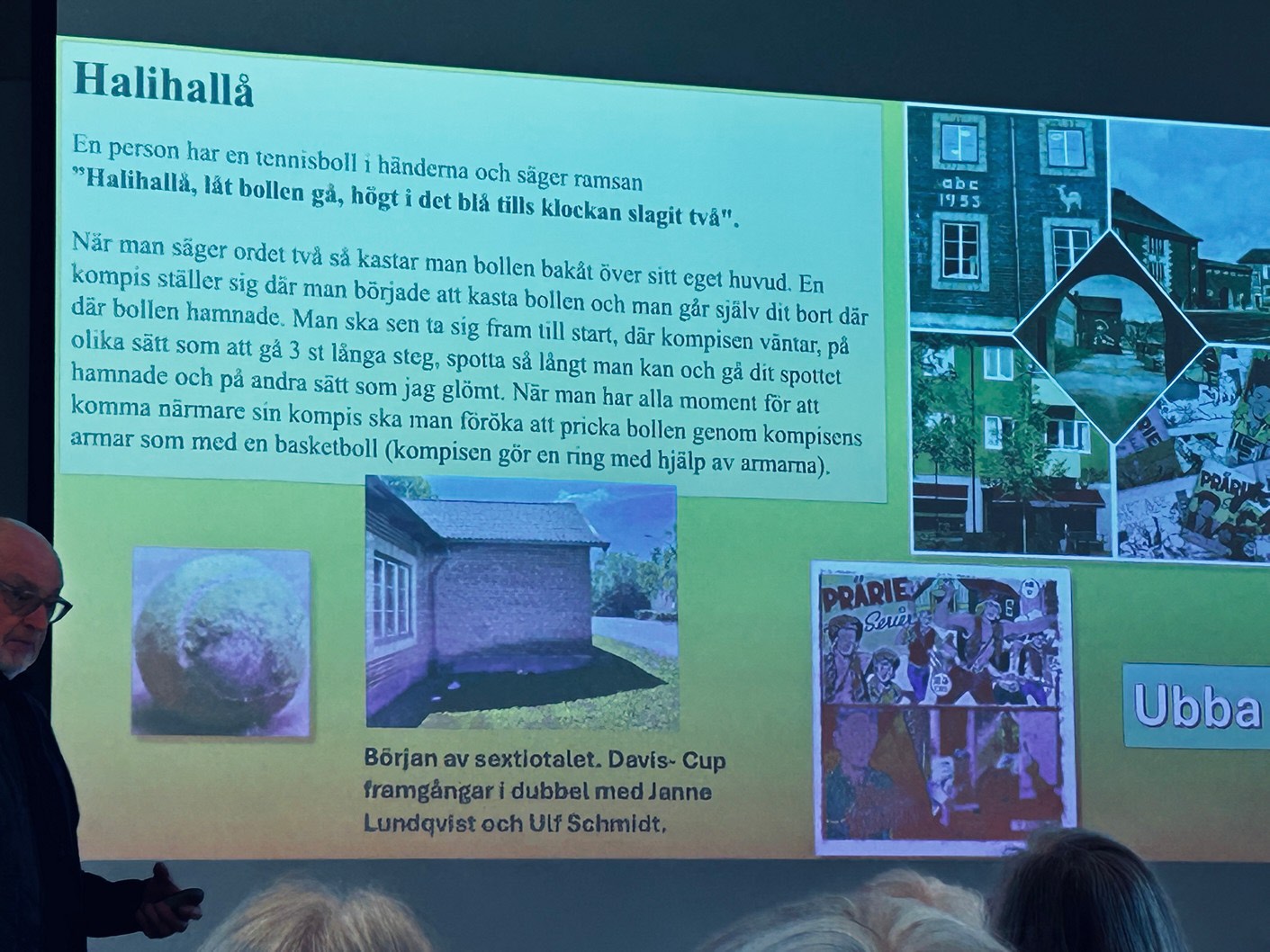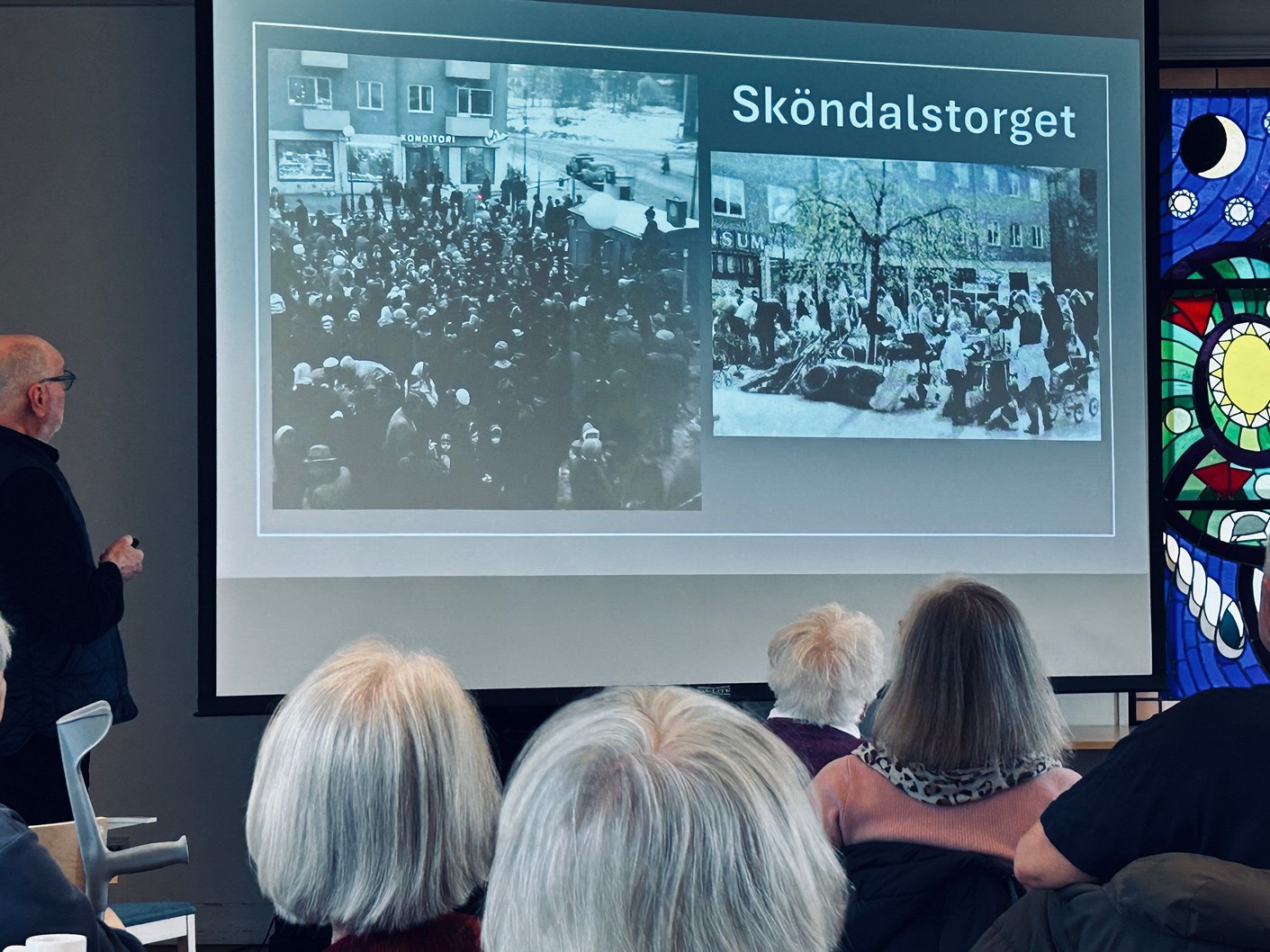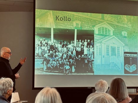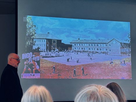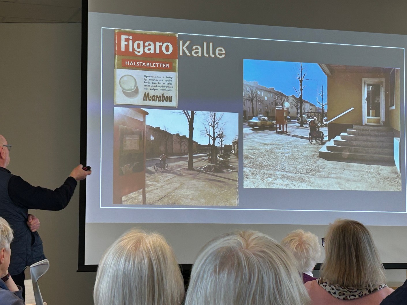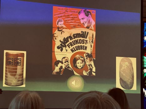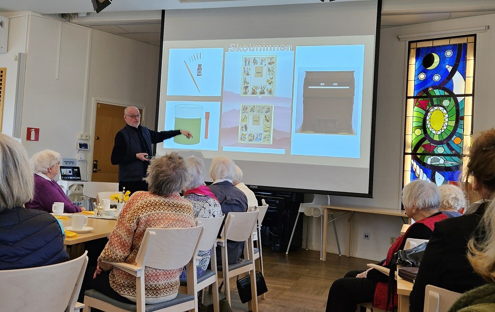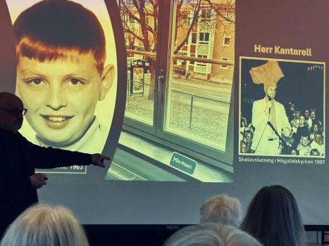Med stor inlevelse tog han oss med på en härlig resa i tid och rum. LÅN är uppvuxen här i Sköndal på 50- och 60-talen och han visade oss en rad bilder från den tiden, varvat med bilder från samma platser idag. Han bjöd oss också på smakprov som talade till alla våra sinnen; Vi fick smaka på Raketost på knäckebröd, vi fick dofta på gammalt hederligt Björnklister och vi fick lyssna till gamla rockklassiker, för att bara ta några exempel ur hans varierande hög. Allt till ackompanjemang av bilder från fotbolls-VM 58, gamla serietidningar, tramporglar och gamla tiders Sköndal.