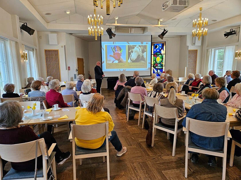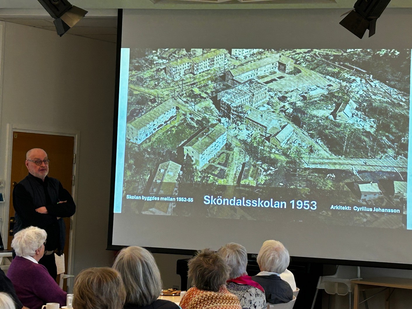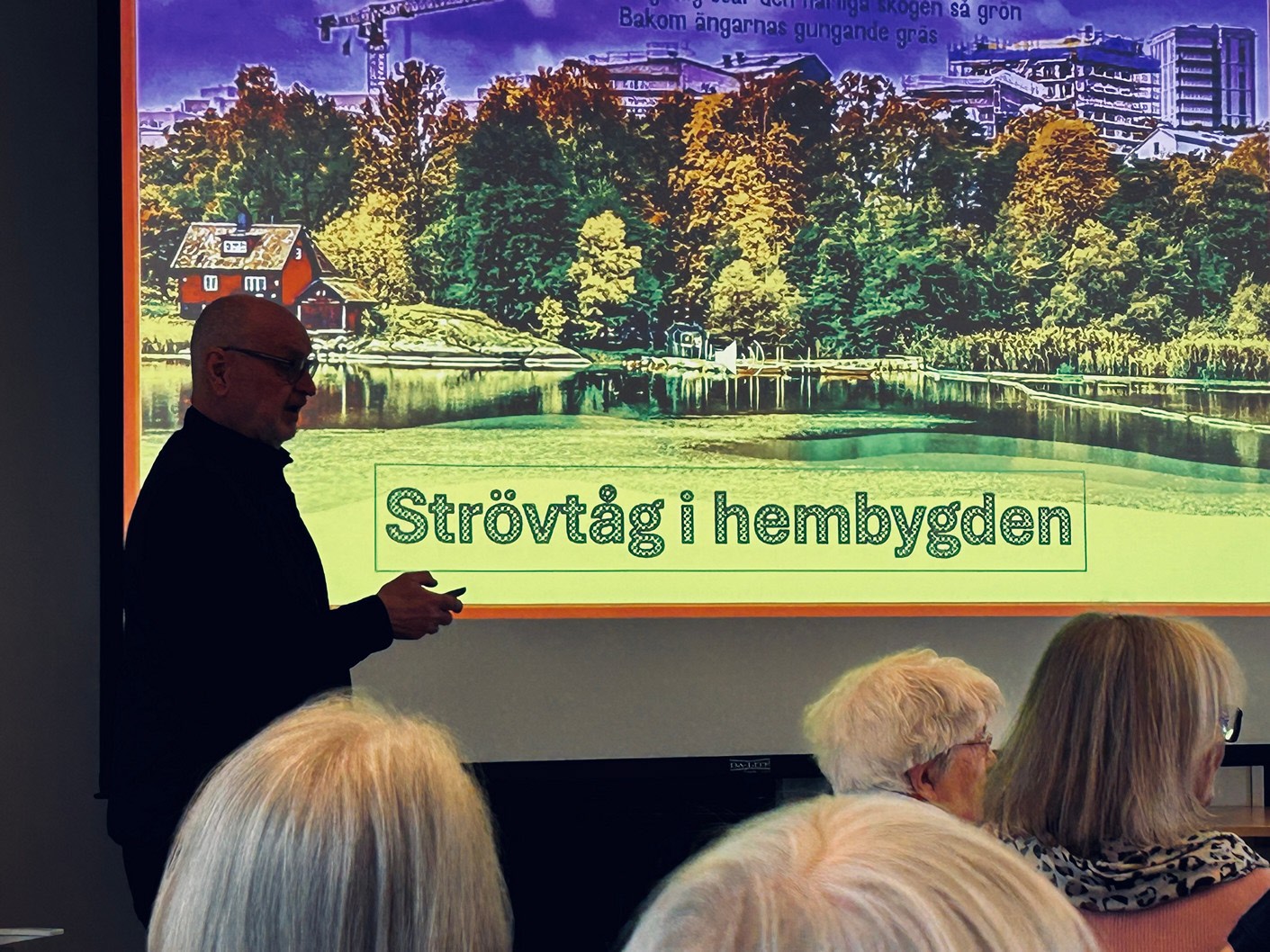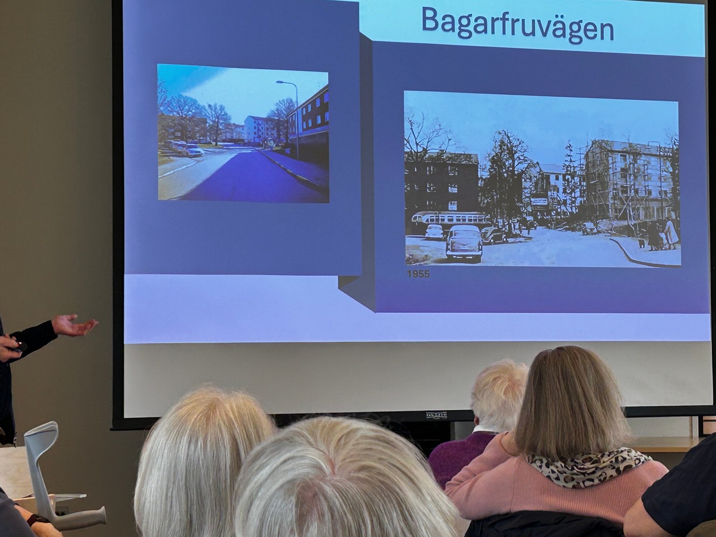 Med stor inlevelse tog han oss med på en härlig resa i tid och rum. LÅN är uppvuxen här i Sköndal på 50- och 60-talen och han visade oss en rad bilder från den tiden, varvat med bilder från samma platser idag. Han bjöd oss också på smakprov som talade till alla våra sinnen; Vi fick smaka på Raketost på knäckebröd, vi fick dofta på gammalt hederligt Björnklister och vi fick lyssna till gamla rockklassiker, för att bara ta några exempel ur hans varierande hög. Allt till ackompanjemang av bilder från fotbolls-VM 58, gamla serietidningar, tramporglar och gamla tiders Sköndal.
