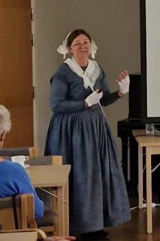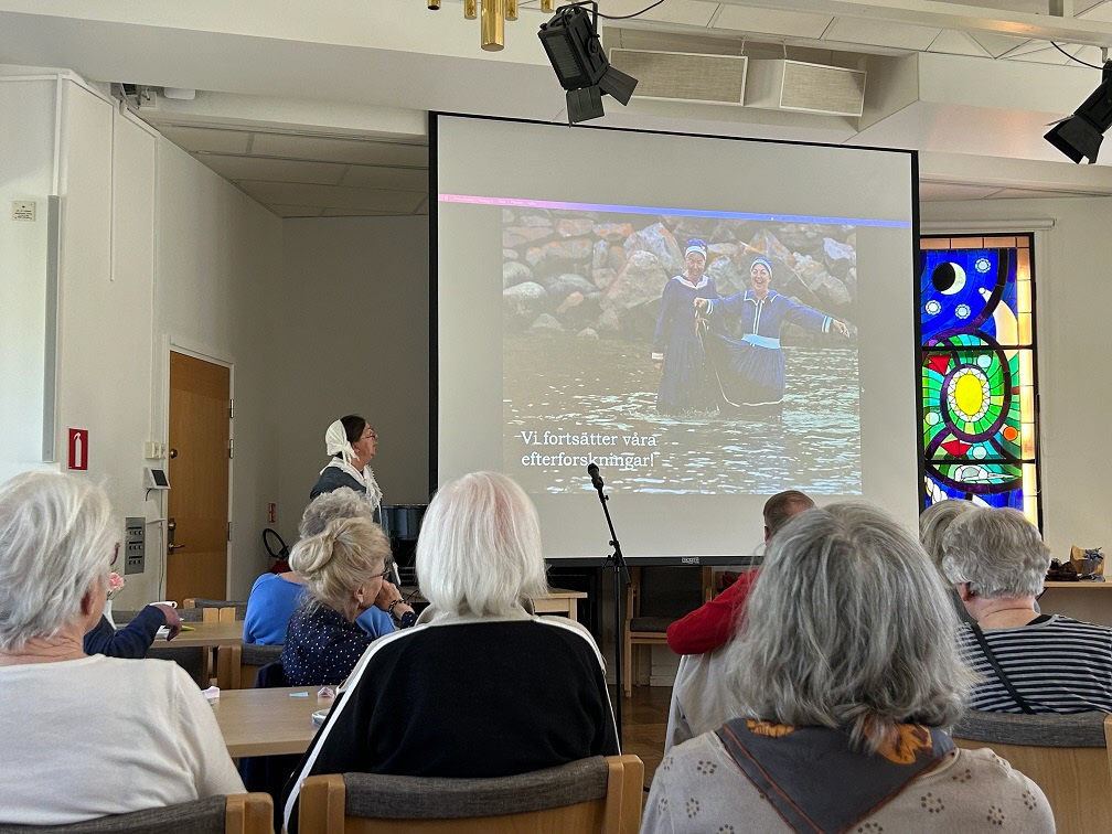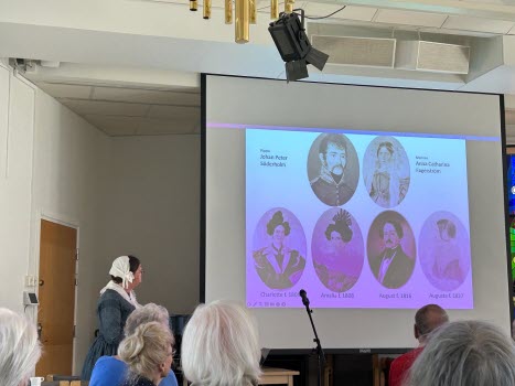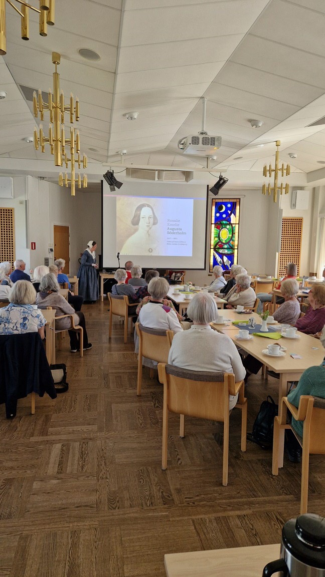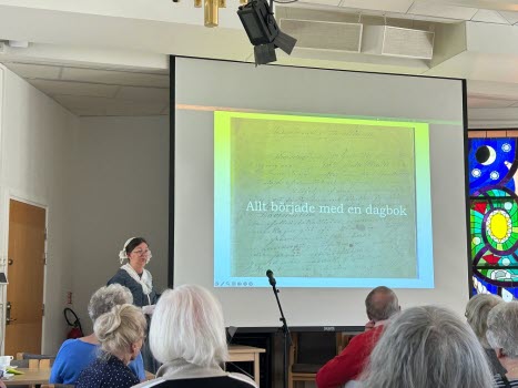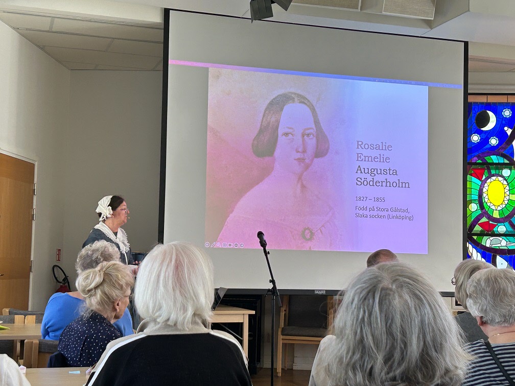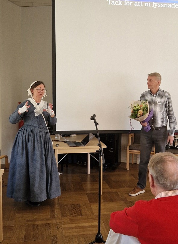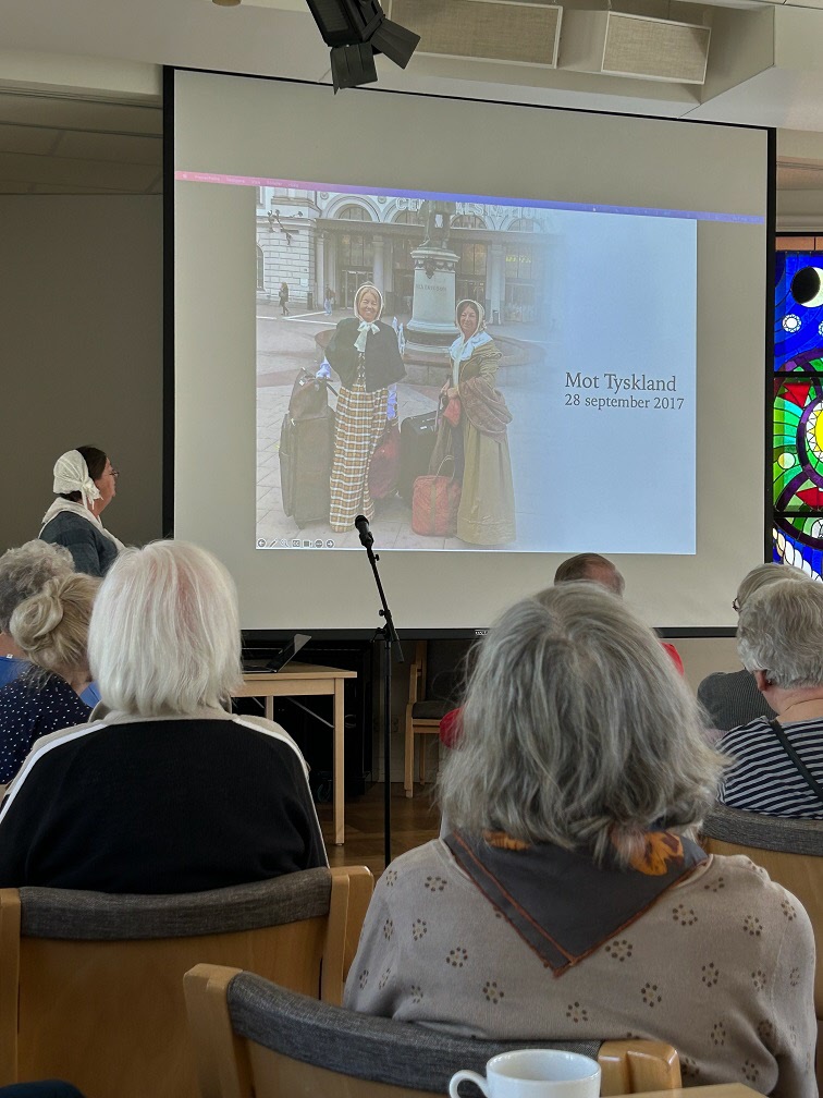 Med strålande vårsol utanför fönstren var vi en stor skara medlemmar som vid månadsmötet den 6 maj tog del av en livfull och intressant berättelse under rubriken Augustas resa framförd av Kerstin Melin. Hon hade dagen till ära klätt sig i samma slags kläder som hennes farmors mormor Augusta bar i början av 1800-talet och det blev ibland svårt att veta om det var Augusta eller hennes barnbarns barnbarn som stod framför oss. Till en kavalkad av vackra bilder berättade Kerstin om hur det som började som ett släktforskningsprojekt med tiden tog formen av en resa i både tid och rum. Hur hon och hennes syster levde sig in i Augustas livsöde och själva följde i hennes fotspår med ångbåt på Göta Kanal och med tåg genom Tyskland.