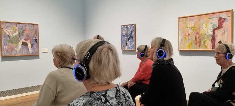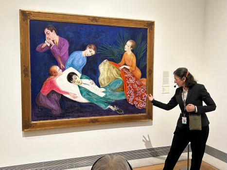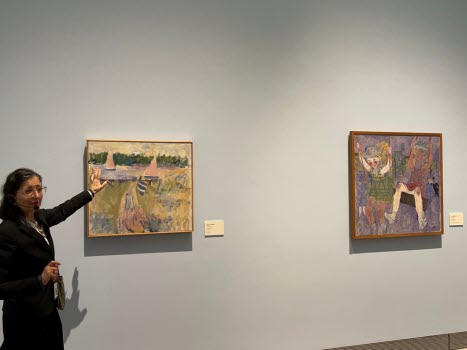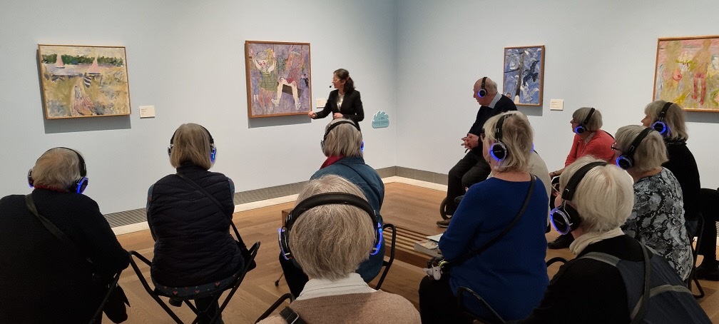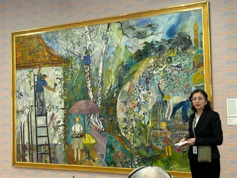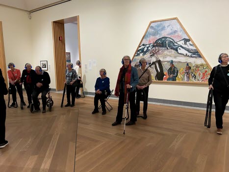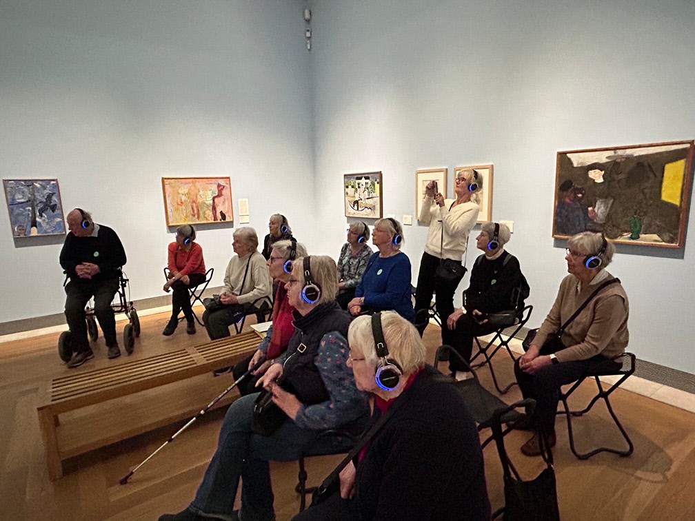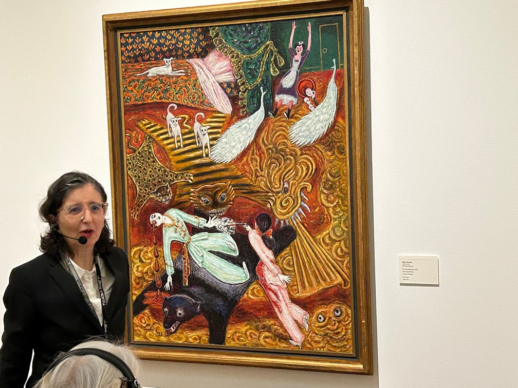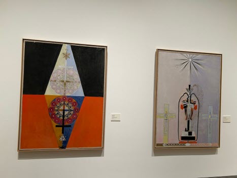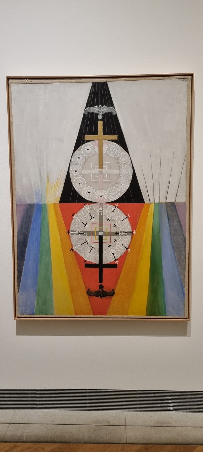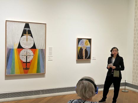 hon ägnade mest tid år var Sigrid Hjertén och X-et Erixson men framförallt två verk av den nu mycket aktuella Hilma af Klint. Det finns så mycket symbolik i Hildas konstverk som kanske vid första ögonkastet ser ganska enkla ut. Efter denna visning tror jag att alla deltagare känner för Hilma af Klint och kommer med intresse följa striden om hur hennes konst skall få visas. Med en entusiastisk guide och en intresserad och aktivt deltagande grupp blev det en lyckad timme.