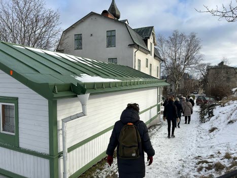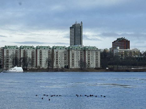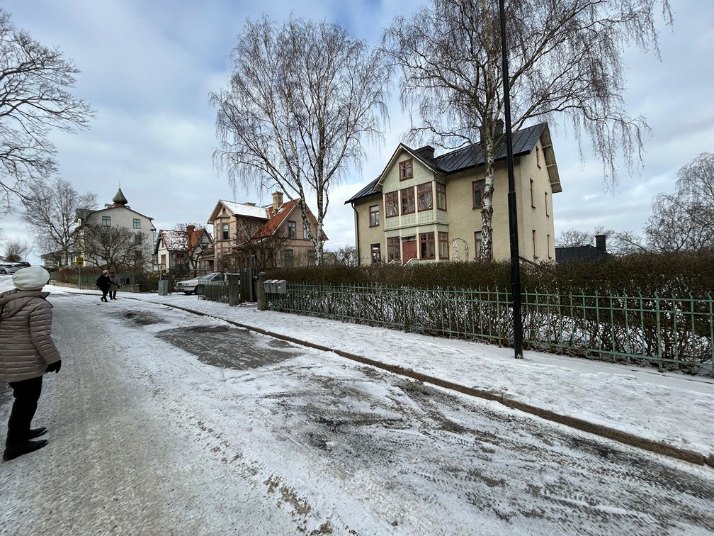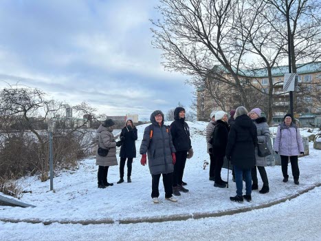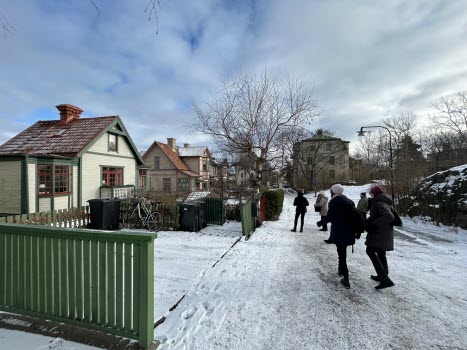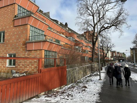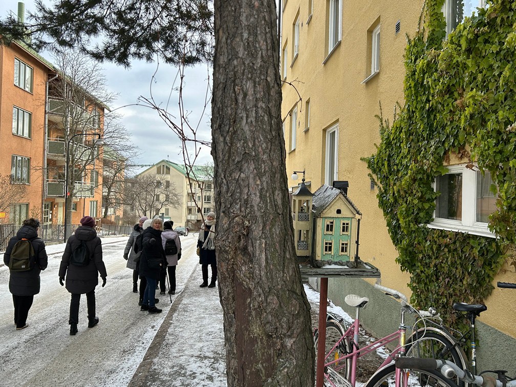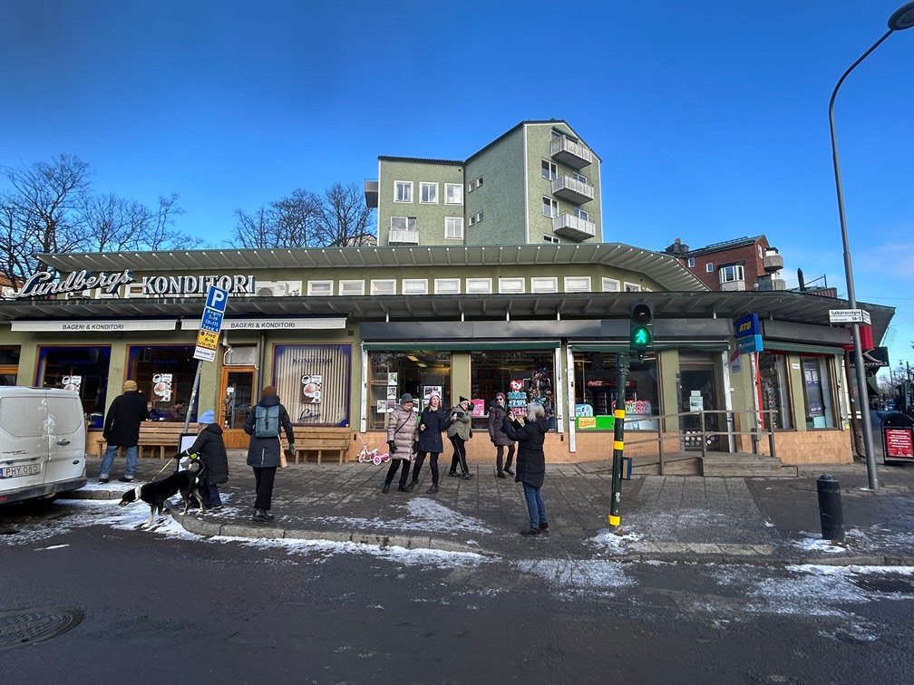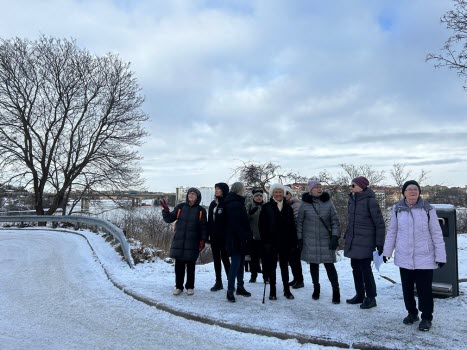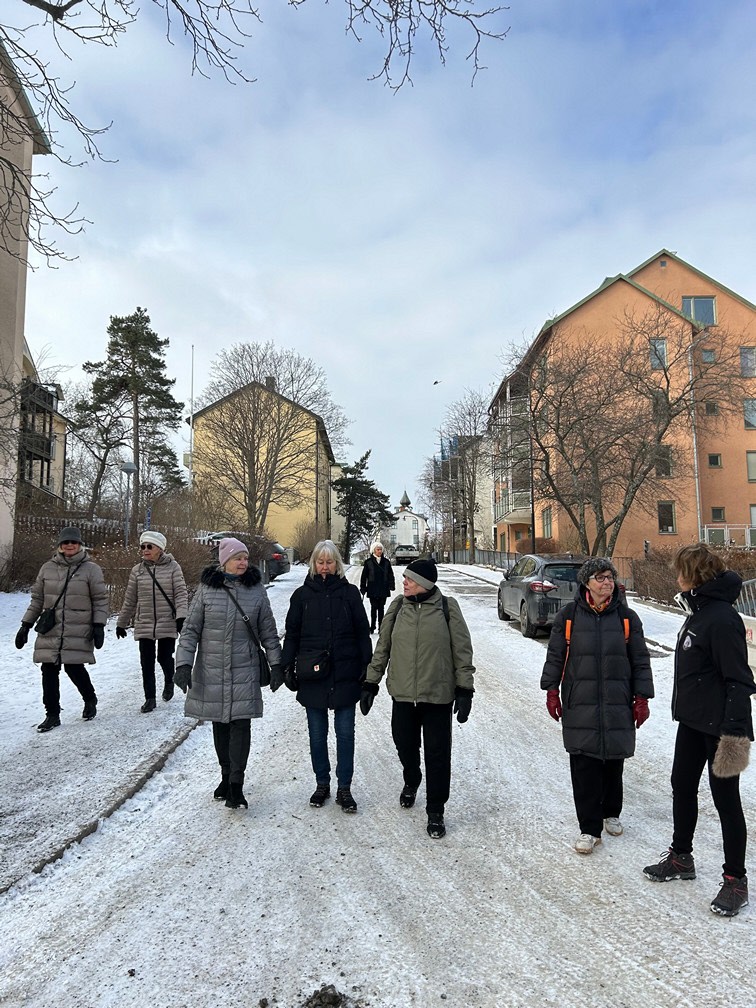 Dagens promenad började med att vi möttes upp vid Gullmarsplans tunnelbanestation. Vi fortsatte sedan med Tvärbanan till Trekantens hållplats. Där gick vi ner mot vattnet och promenerade längs strandkanten hela vägen till Gröndal. Det var verkligen en plats där gammal och ny bebyggelse möttes! Vi fick njuta av många vackra, äldre byggnader samt några av de välkända verk av Olle Engkvist. Totalt var vi 12 damer som utforskade området till fots, och vi avslutade vår vandring med en välförtjänt fika på Lundbergs Konditori.