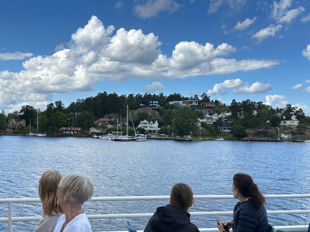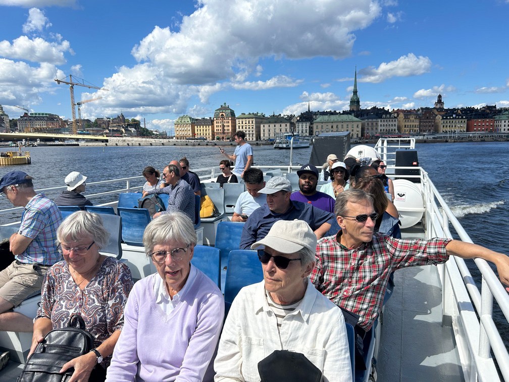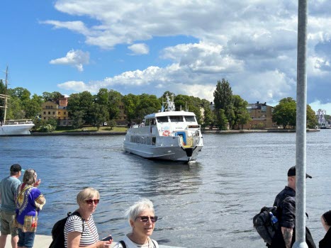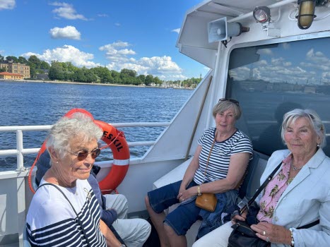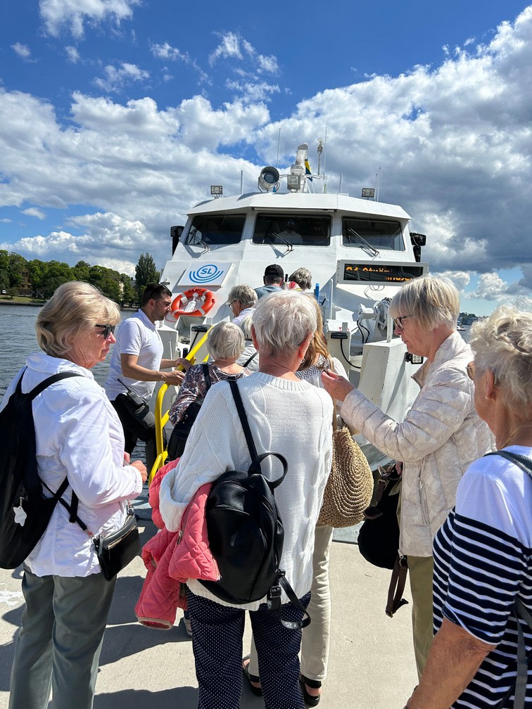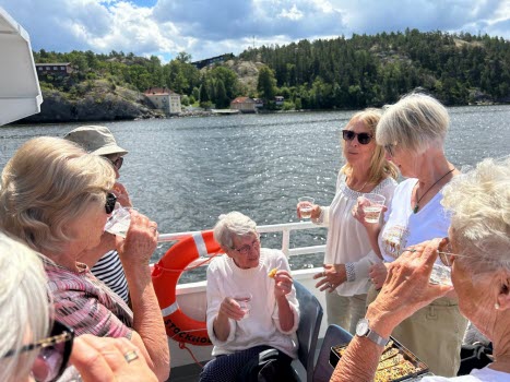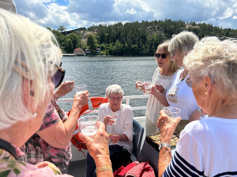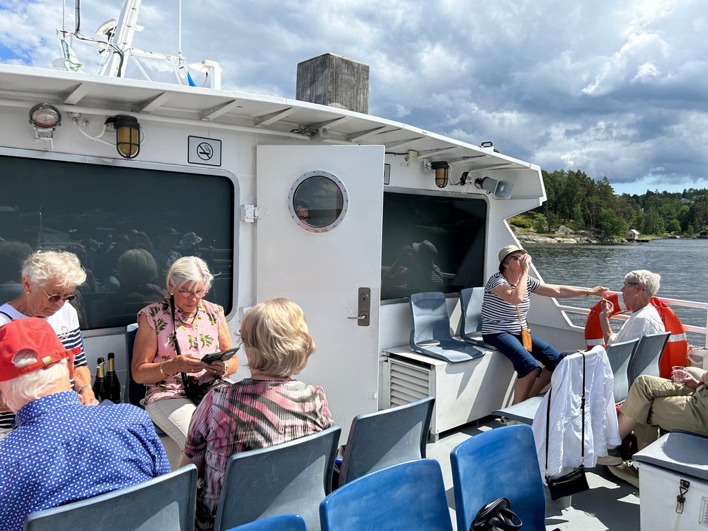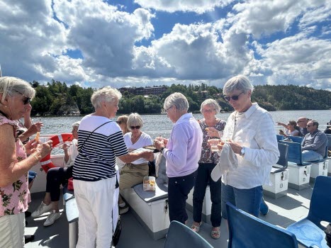 Den här tisdagen hade Birgitta planerat en trevlig båtutflykt från Skeppsbron till Ålstäket på Värmdö med en ny SL-pendelbåt. Promenadgruppen fick reda på att Birgitta fyller år den dagen och vi bestämde oss för att överraska henne och fira hennes dag med lite bubbel och tilltugg. Det blev en mycket trevlig två timmars båtutflykt för 13 av oss som fick fira och tacka Birgitta för alla fina promenader hon planerar och ordnar för gruppen. Marianne och Karin hade ordnat med tilltugg till bubblet. Det fanns en enklare servering på båten där de hungriga kunde köpa en extra förstärkning under tillbaka resan.