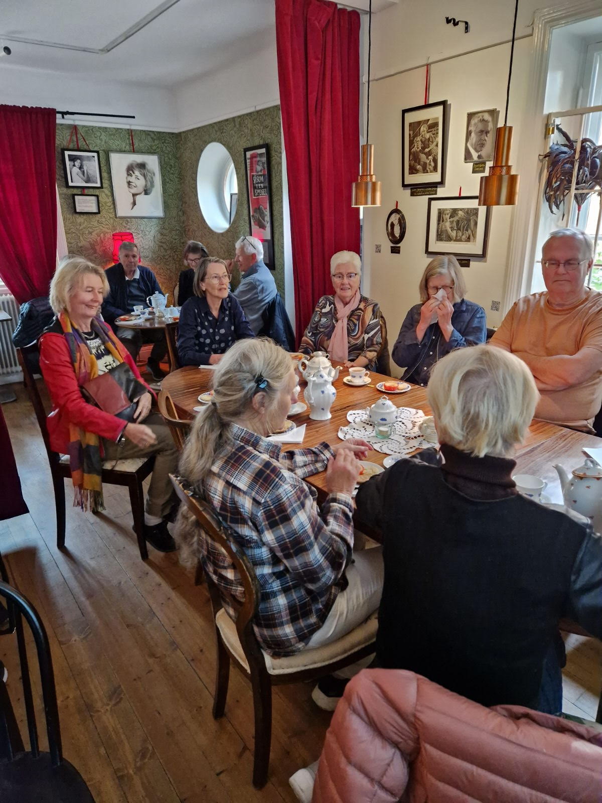 Avslutningsvis intogs kaffe och kakor i Portvaktsstugan där Tobias också visade filmklipp från SF:s storhetstid med stjärnor som Greta Garbo, Tutta Rolf, Sickan Carlsson, Nils Poppe, Thor Modéen med flera.