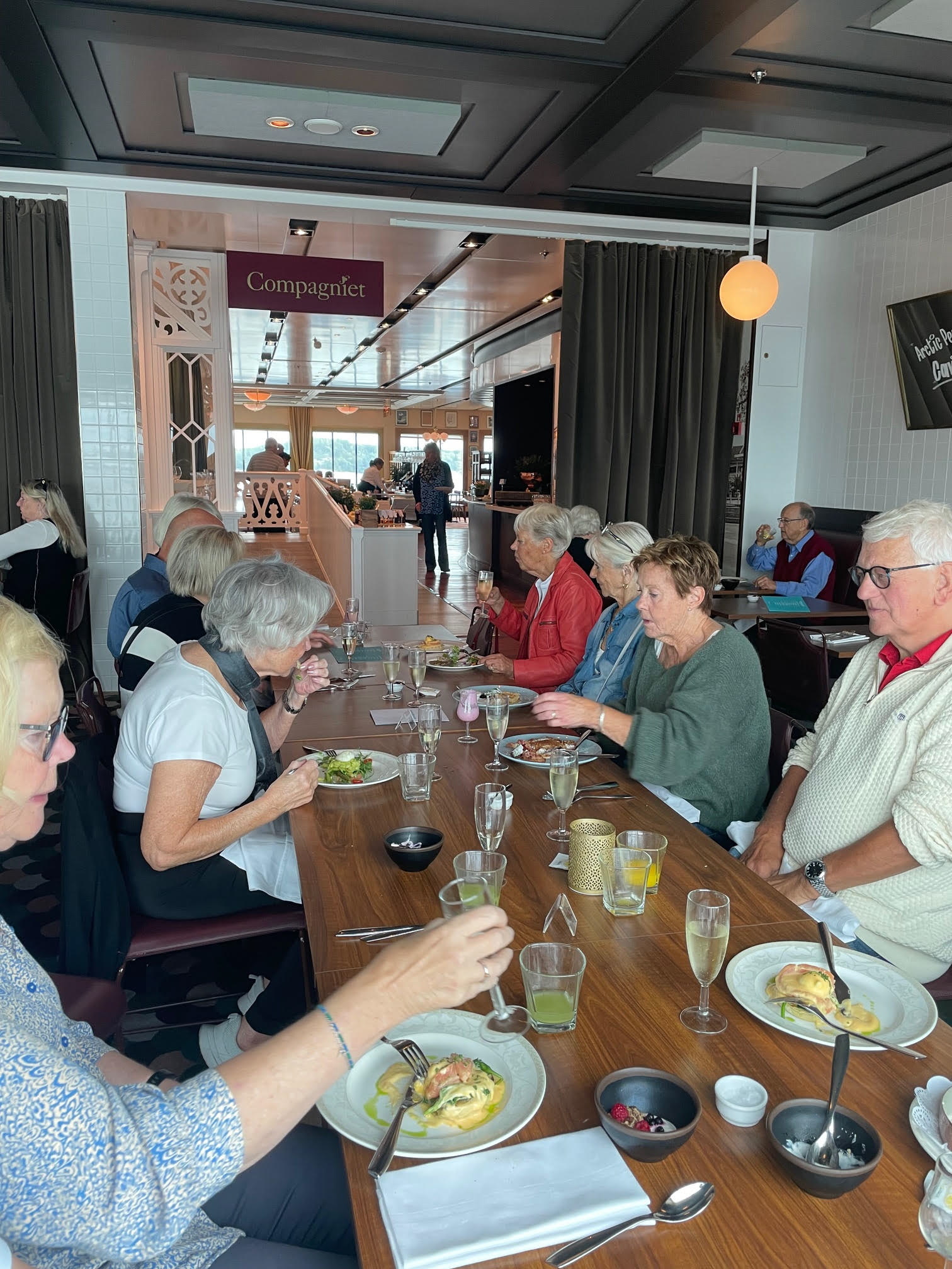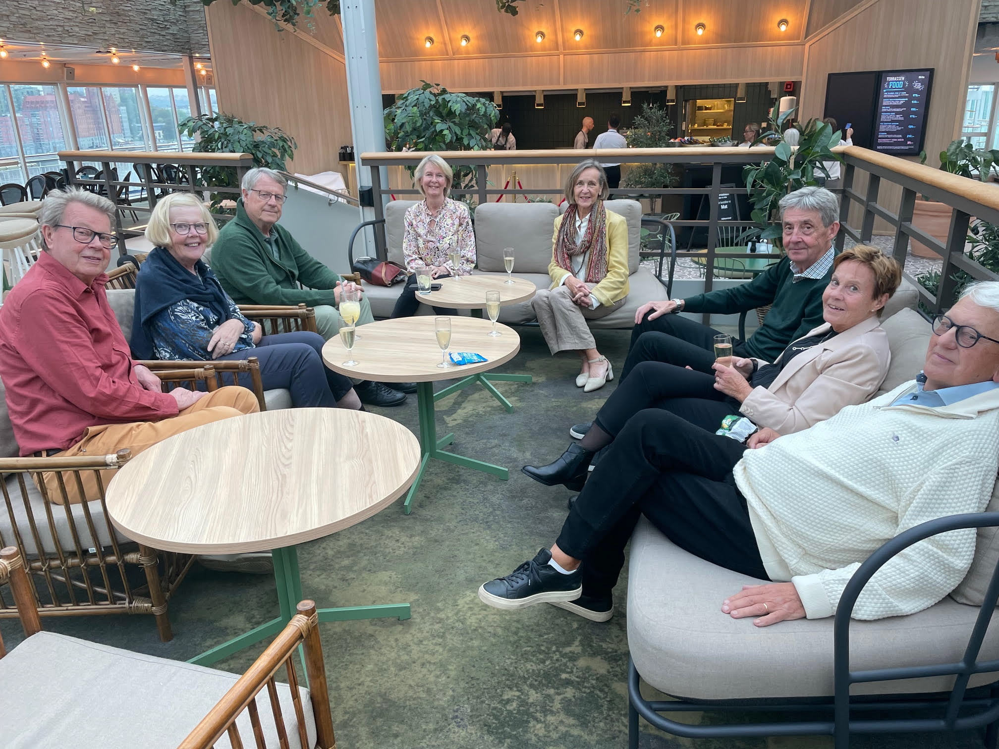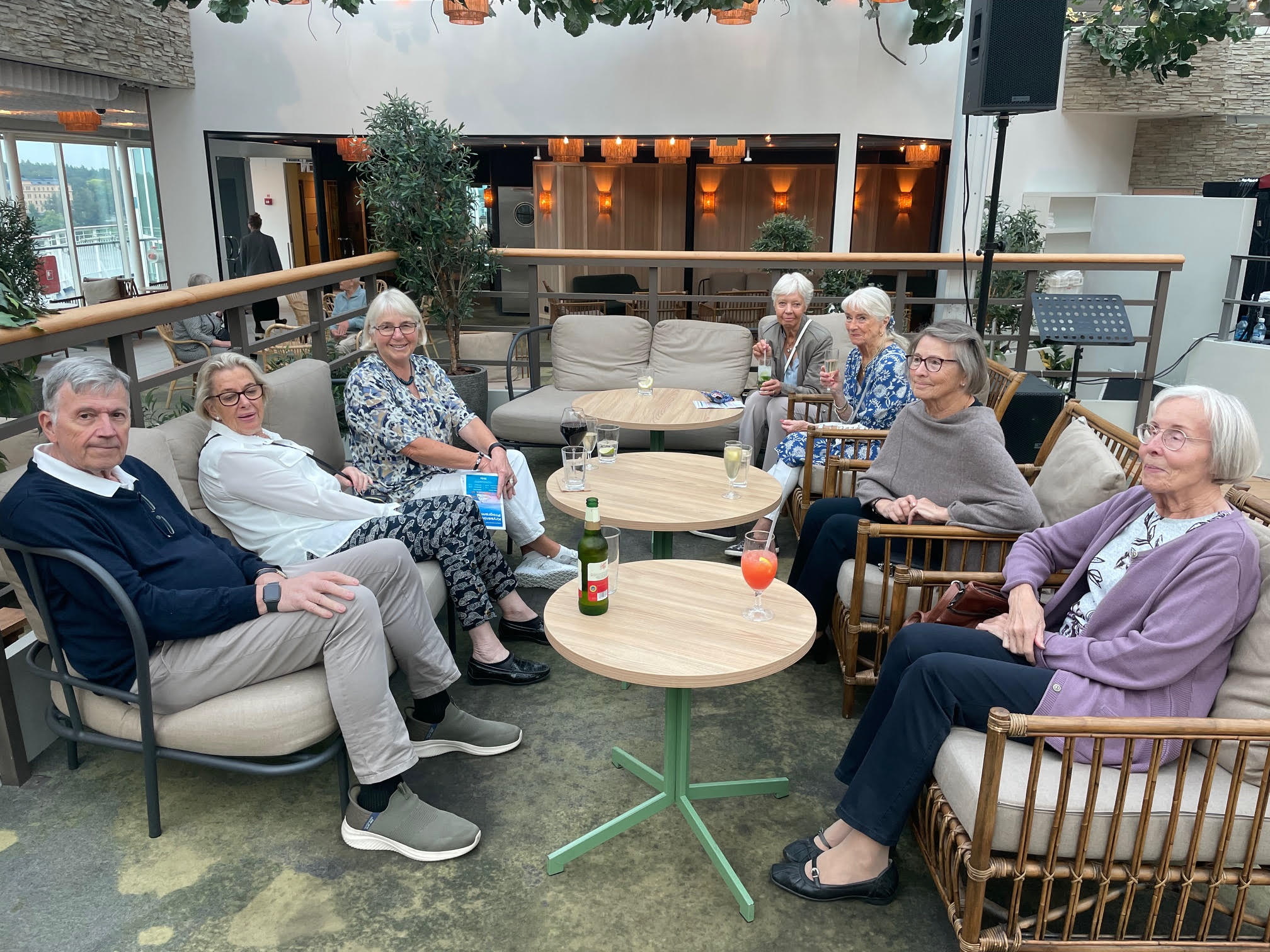 Vi var 19 skaldjurssugna SPF’are som samlades vid Vikingterminalen på Stadsgårdskajen i Stockholm i fint sommarväder. Vi åkte med Birka Gotland ett dygn som tog oss tur och retur till Åland. Efter incheckning i våra hytter samlades hela gänget högst upp (plan 10) i en lokal som heter Terassen. Där tog många något att dricka innan maten.