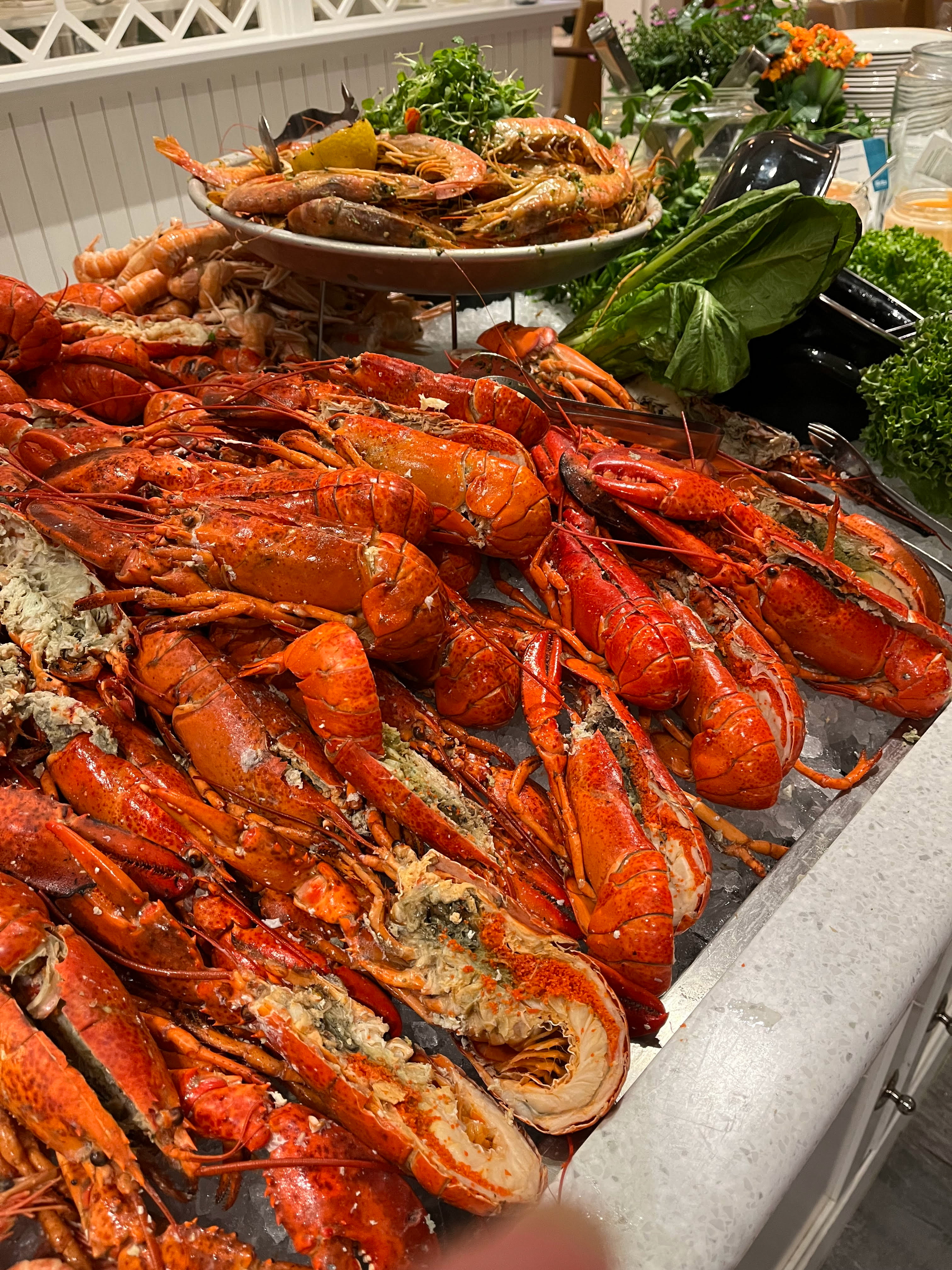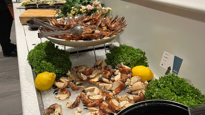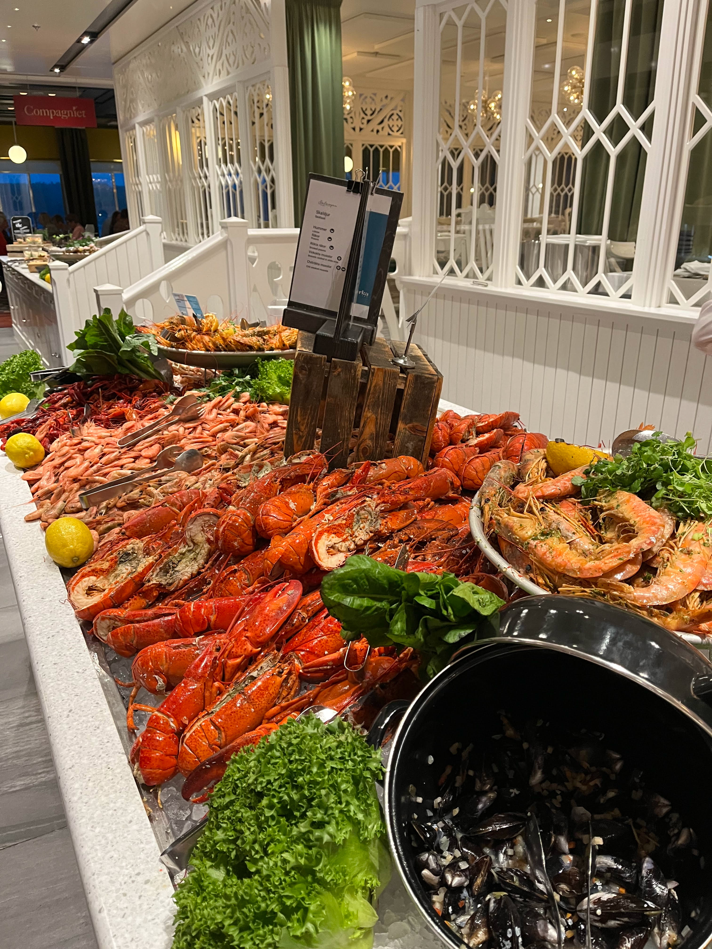 Den omtalade skaldjursbuffén bestod av allehanda läckerheter som hummer, havskräftor, vanliga kräftor, räkor (färska och rökta), krabbklor och musslor. Till skaldjuren serverades god levain baguette med västerbotten-, präst- och kastellost från Åland. Allt var mycket välsmakande.