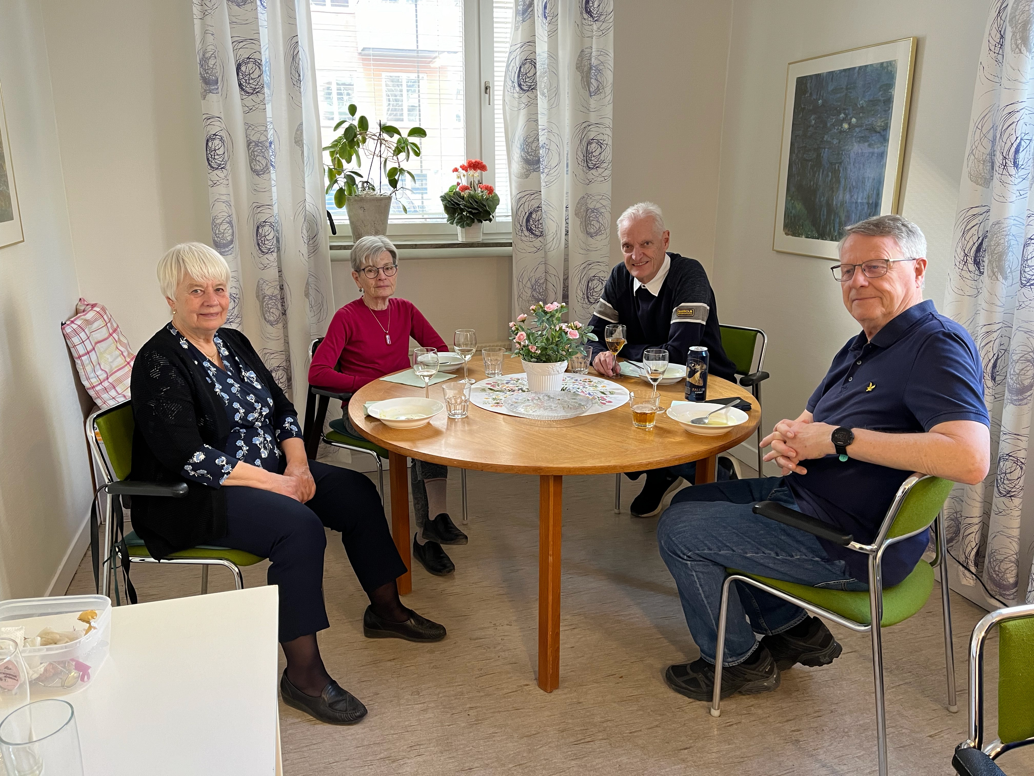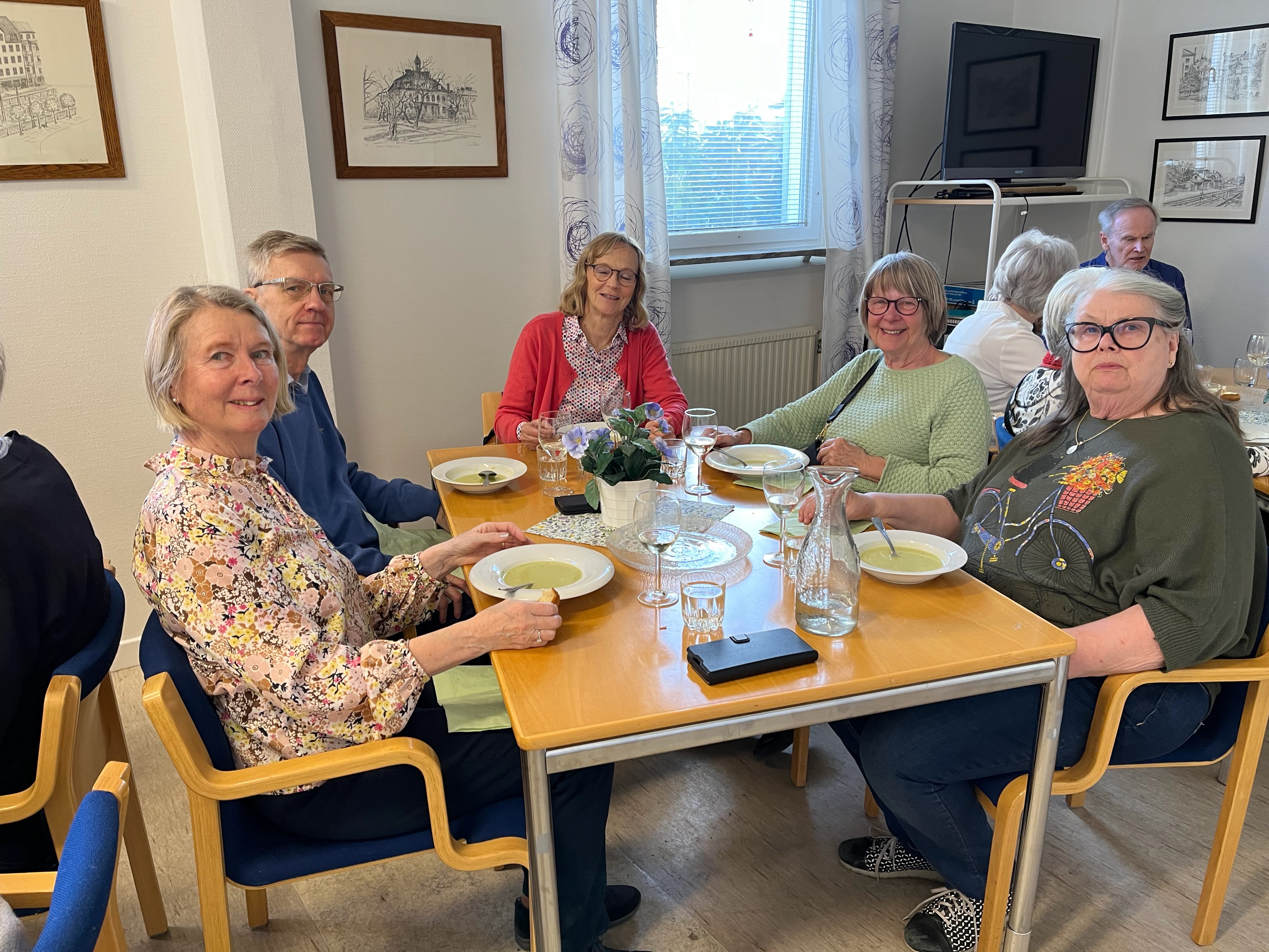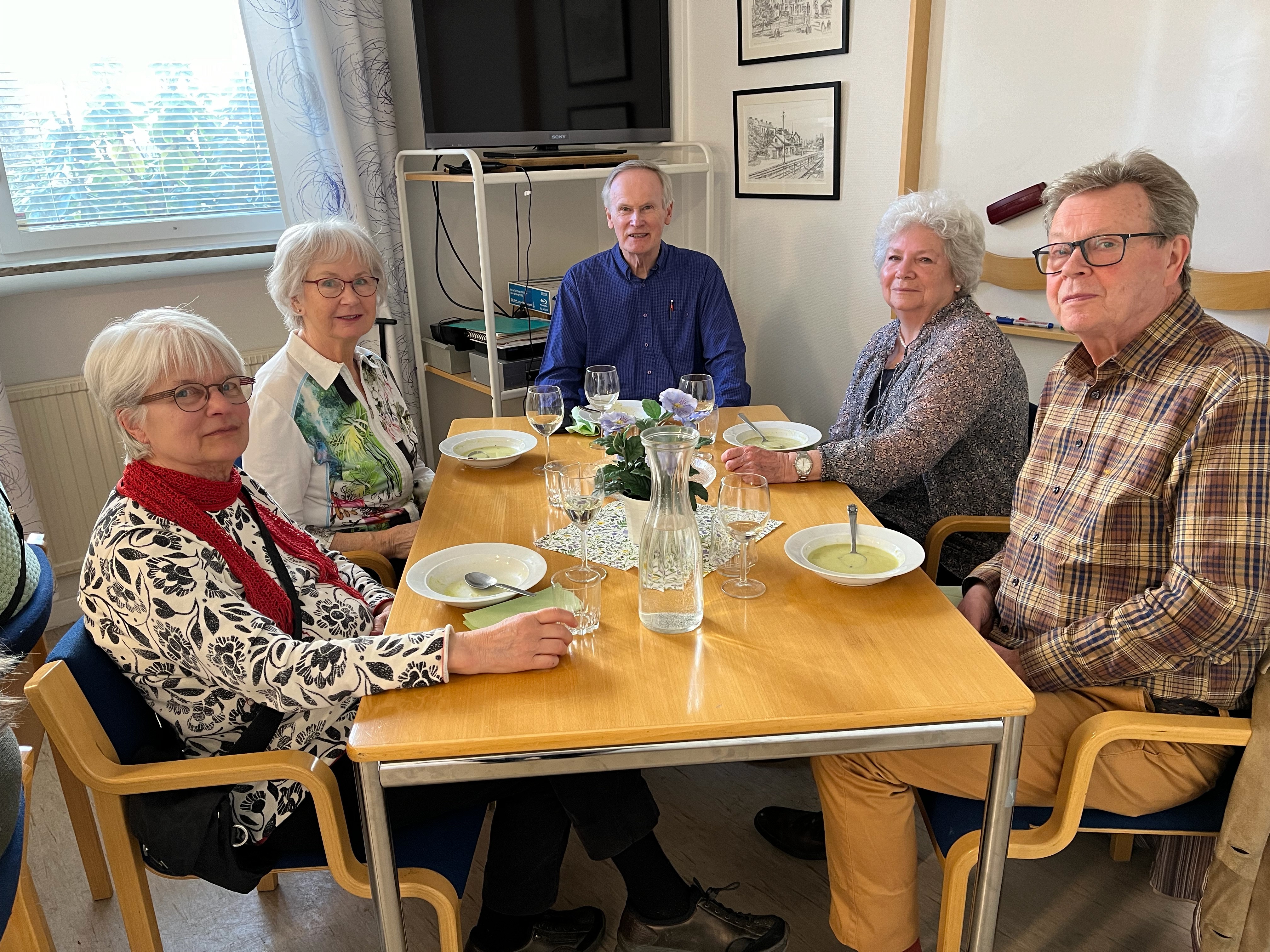 När vi kom, bjöds vi på ärtsoppa Creme ninon tillagad av Ginger Jureskog, till soppan bröd och ett glas mouserande vin. Såå gott!