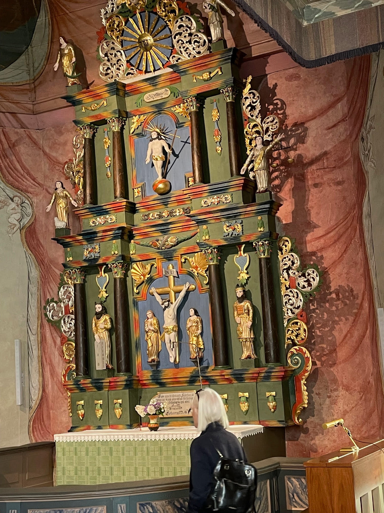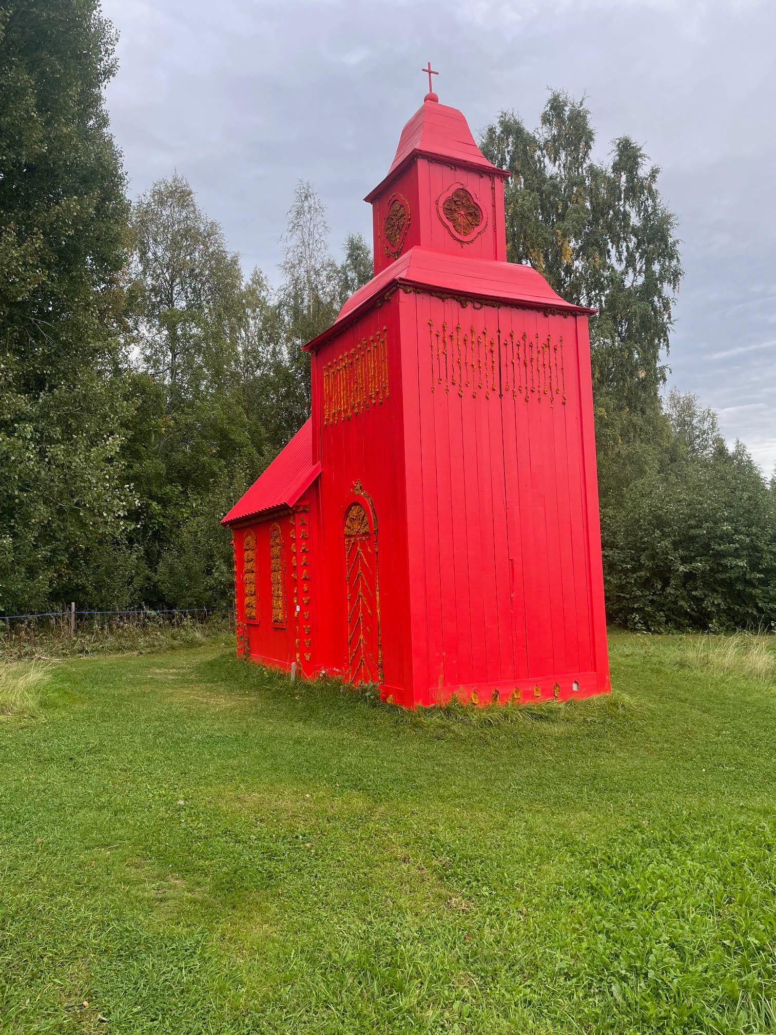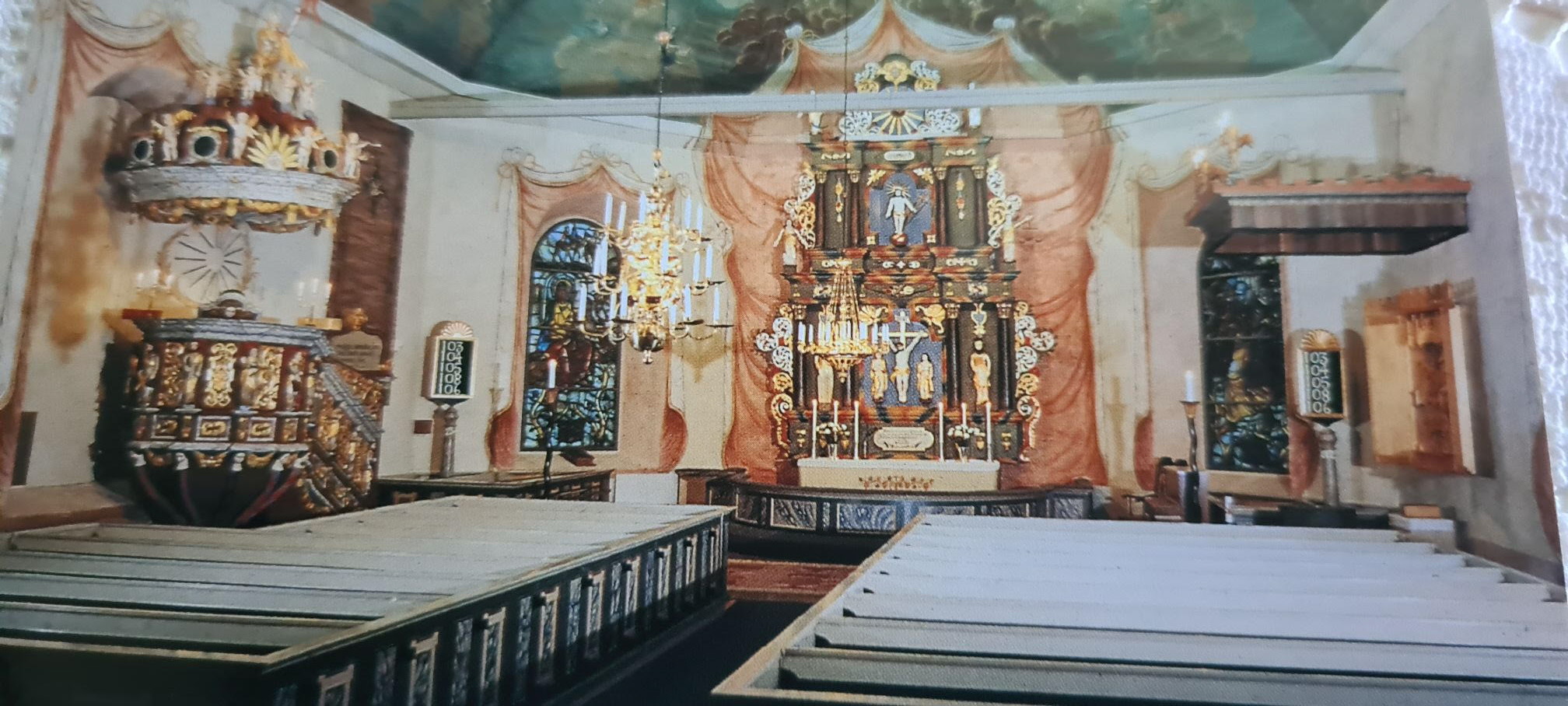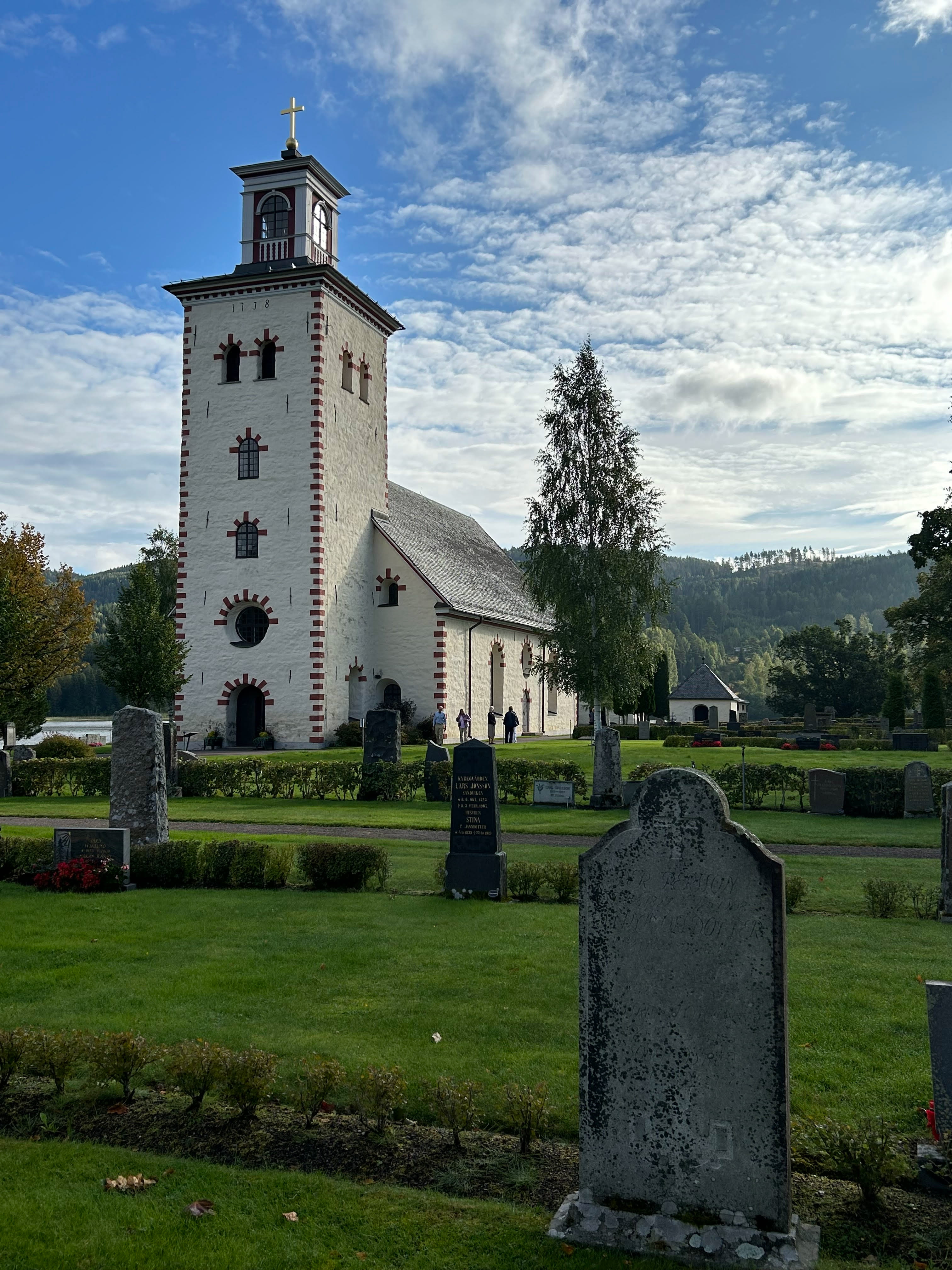 Ny dag - nya besök. Gräsmarks kyrka stod först på tur. Kyrkan låg mycket vackert vid sjön Rottnen. I kyrkan fick vi höra en inspelning som berättade om de vackra målningarna på väggarna. Vilken vinst kyrkan fått då man tagit fram dessa vackra övermålade bilder. Vid orgelläktaren kunde vi se en målning av domedagen.