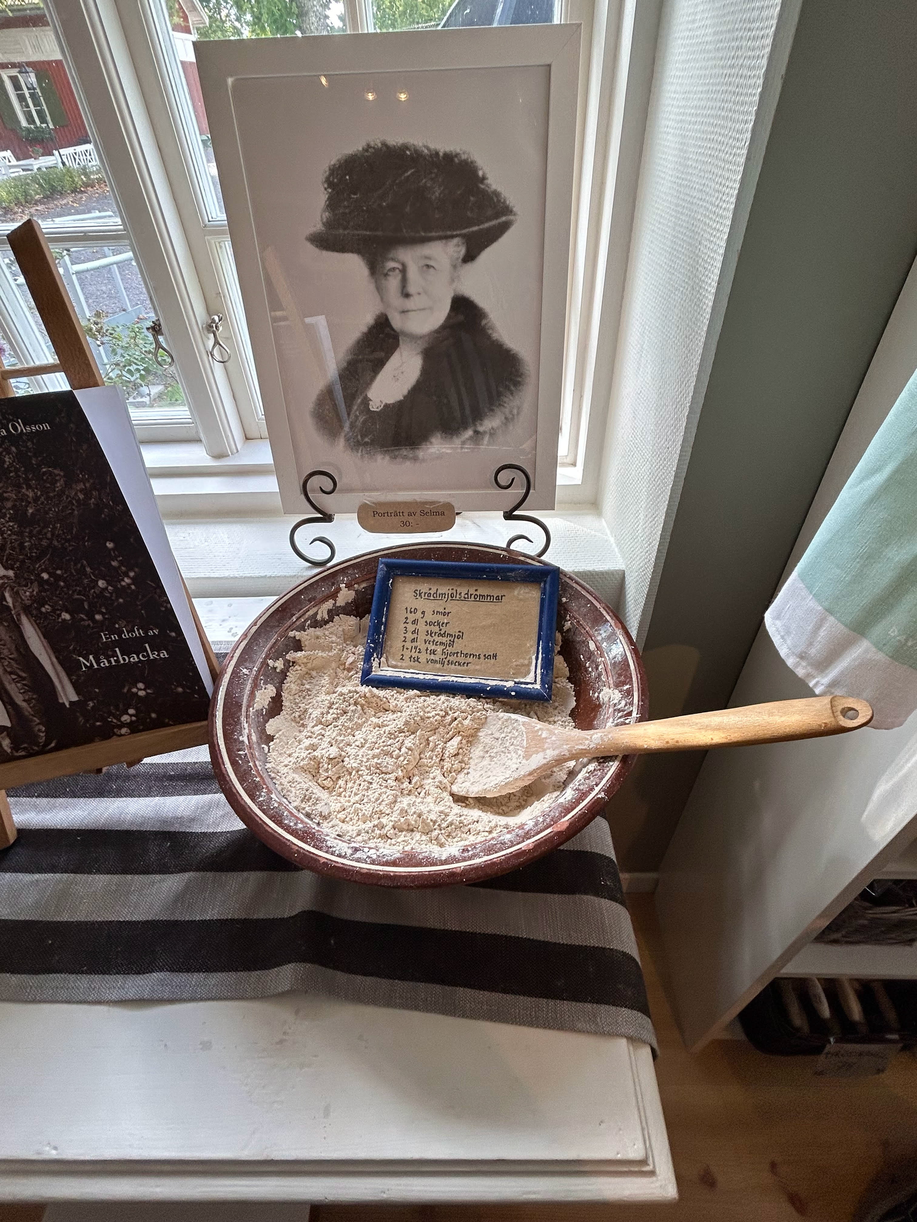Selma Lagerlöfs Mårbacka stod nu på tur. Vi fick en liten stund bland äppelträd och blomsterrabatter innan det var dags att se Mårbackas fina rum. Selma hade varit en hårt skrivande dam som samtidigt ömmade om sina anställda. Till jul fick alla anställda julklappar som Selma själv ordnade. Selma skrev flitigt hem till familjen på sina resor ute i världen. I lilla shoppen på Mårbacka kunde vi köpa hennes böcker och ”Skrädmjöl” ett mjöl som Selma ordnat med att det gick på export till USA.