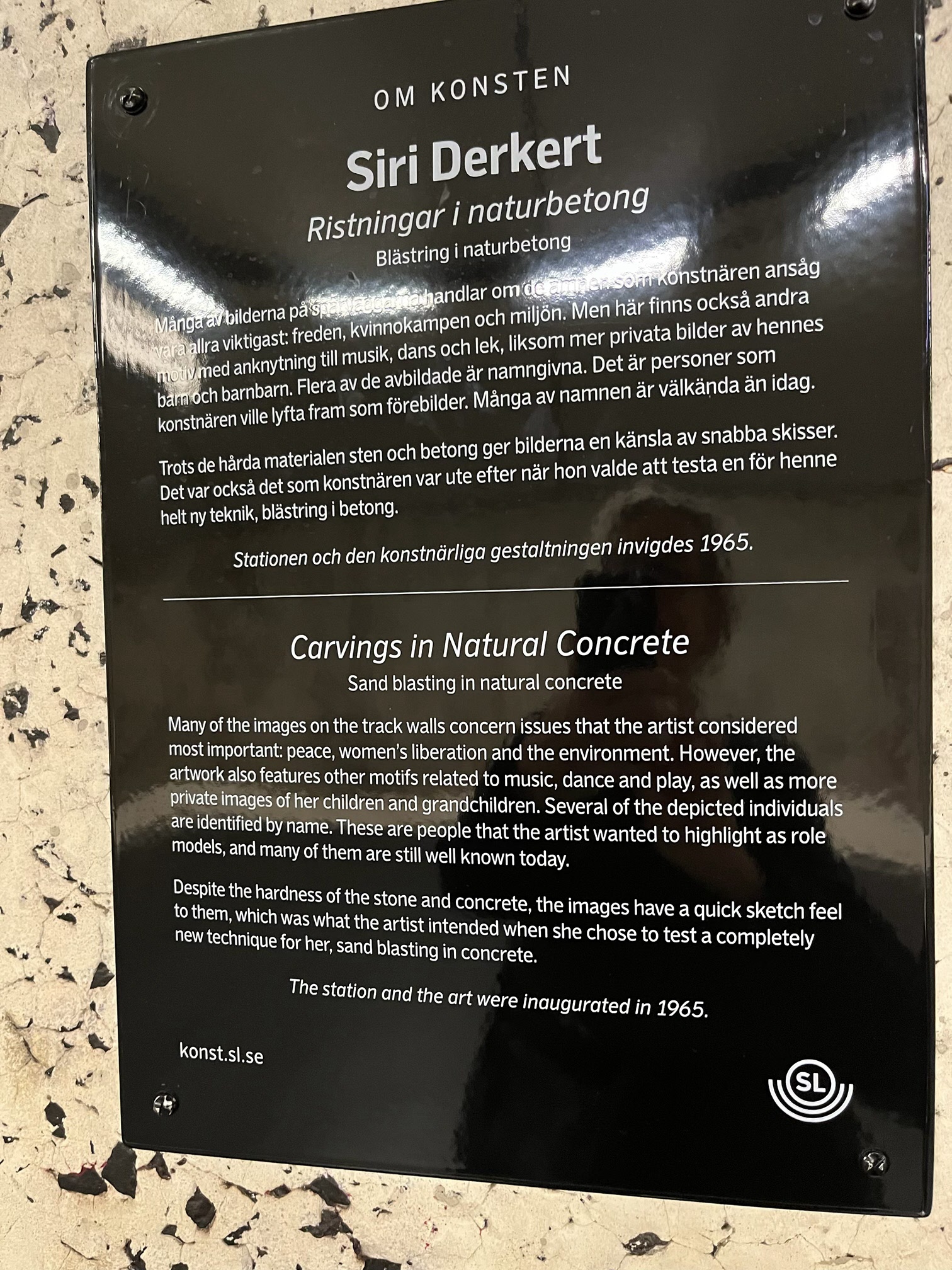 Den sista stationen, Östermalmstorg, är Siri Derkerts närmast herkuleanska bedrift där hon själv ritade och blästrade sina budskap om jämlikhet, miljö och fred.