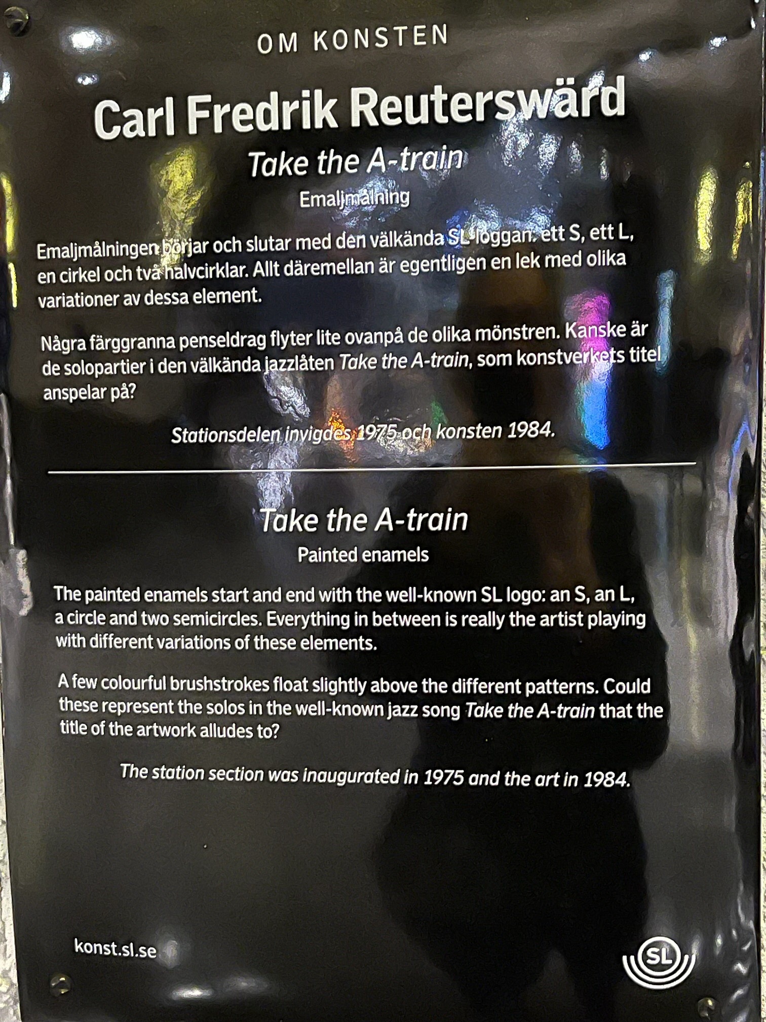 T-centralen består av en lugnande, blå färg och silhuetter av stationens arbetare i Per-Olof Ultveds vision, medan Carl Fredrik Reuterswärd bjuder oss på en musikalisk resa till tonerna av Duke Ellingtons "Take the A-train".