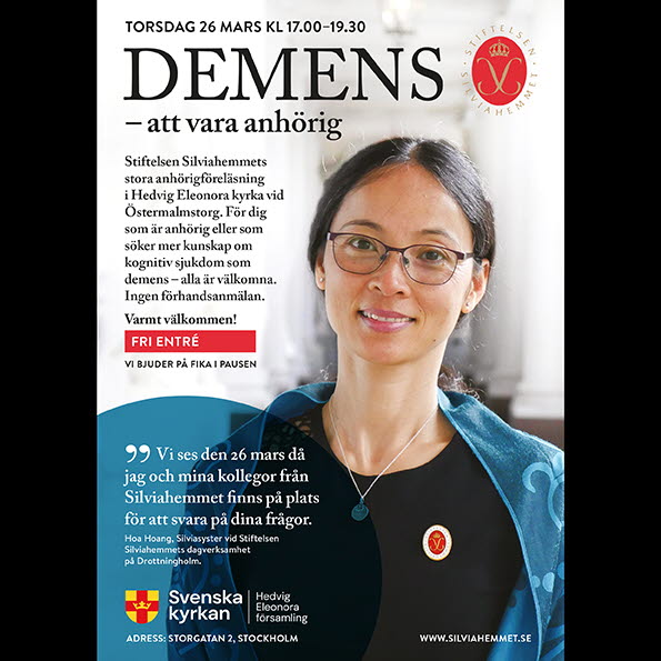 Demens - att vara anhörig. Det är rubriken på en gratis föreläsning för anhöriga som Silviahemmet arrangerar i Hedvig Eleonora kyrka torsdag 26 mars.