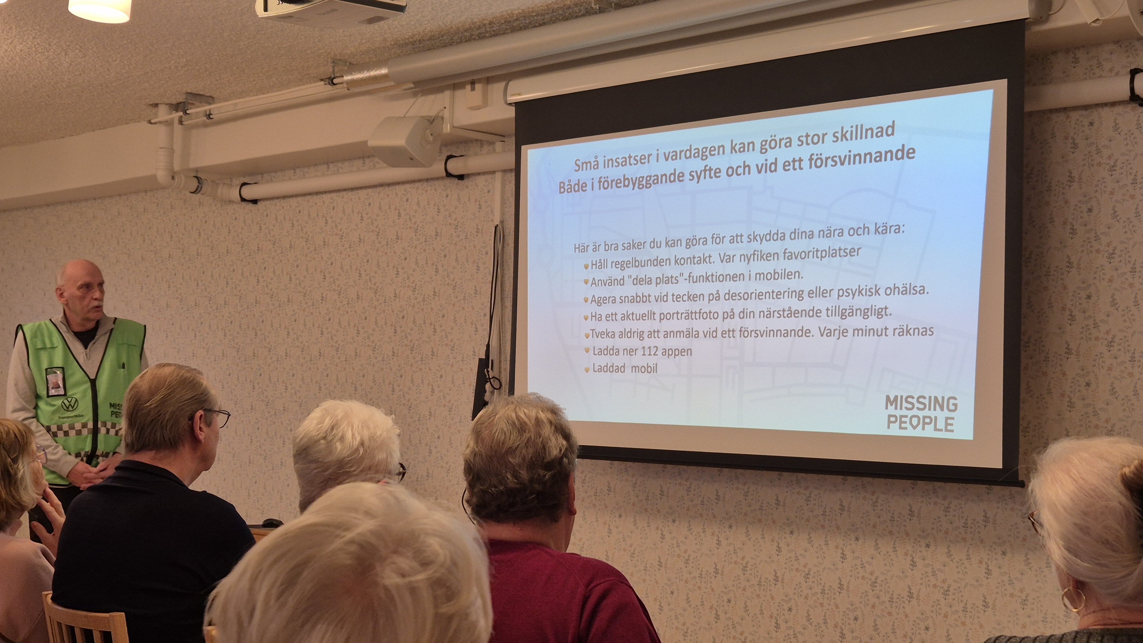 Kent Möller Andersen från Missing People berättade om det som inte får hända men ändå sker. De nästan 50 åhörarna visste inte så mycket om hur denna viktiga ideella, rikstäckande organisation fungerade. Kent berättade att de hjälper Polis och anhöriga när någon anhörig eller bekant bara försvinner. Det kan bero på sjukdomar, polisiära händelser och mycket mer.