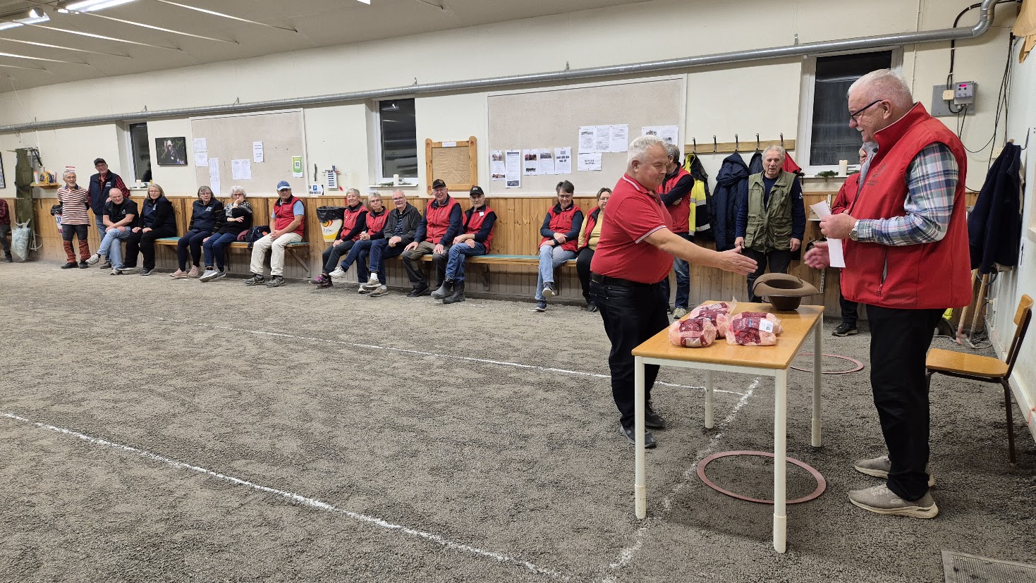 Men nu är det inga tremanna lag utan singelspel, så där står man ensam med tre klot i handen för att kämpa man mot man. Det var 40 spelare, damer och herrar, som skulle kämpa om de åtråvärda julskinkorna, de fem första vann en skinka och sedan lottades ytterligare fem skinkor ut på startnumren. Det kom lag från både PRO, SPF Trögd och SPF Grillby.