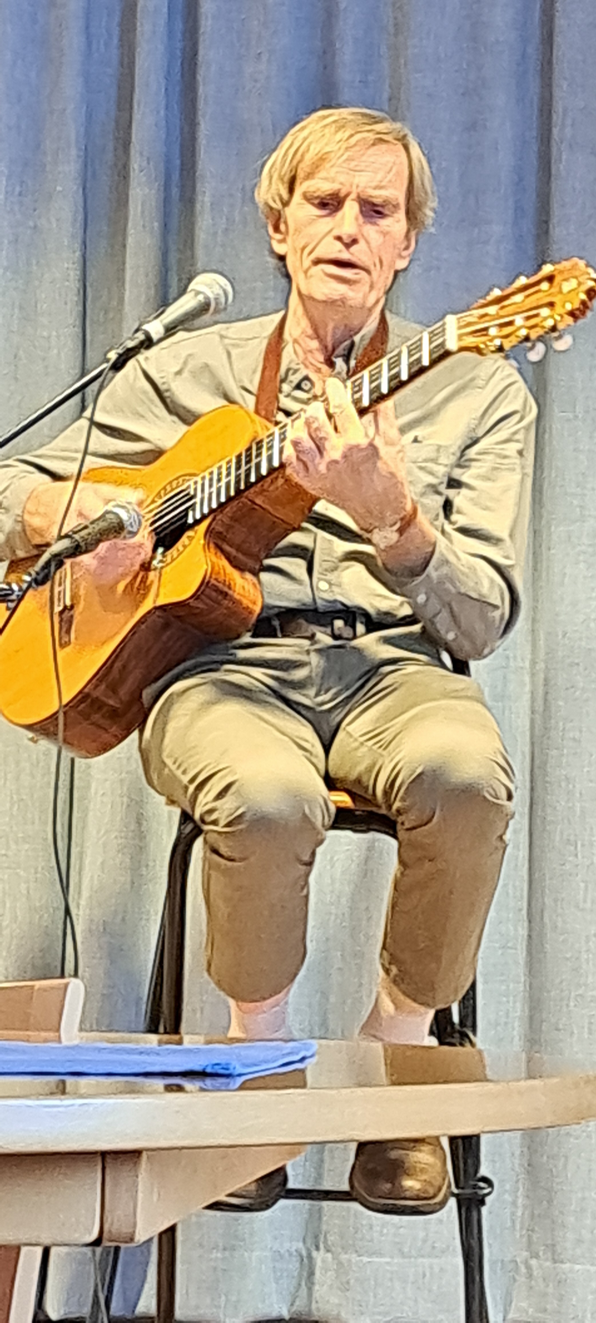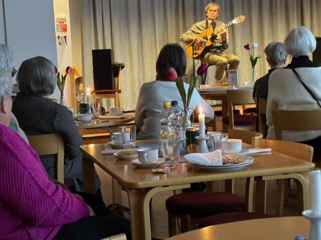 Efter lunch med lasagne, sallad och kaffe underhåller Leif Helde med trevliga ballader till eget gitarrspel.