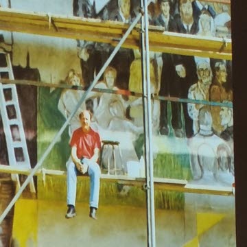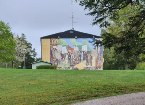 Konstnären Roine Jansson berättade om tillblivelsen av den stora väggmålningen vid infarten till Österbybruk