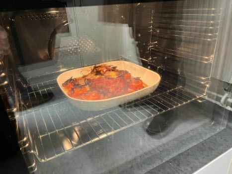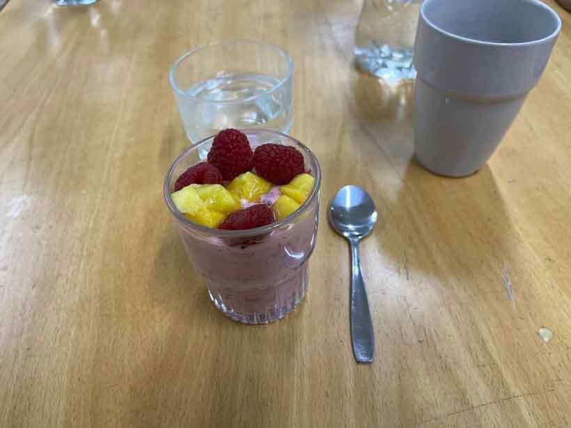 Idag lagade vi Morbergs köttfärslimpa med bacon, tomater, kantarellsås och kokt potatis och som efterrätt fruktig dessert i glas. (Turkisk yoghurt, hallon och mango.)