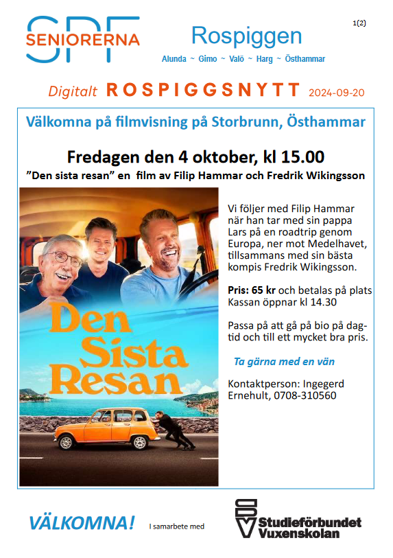 Vi gör ett försök med bio på dagtid för våra medlemmar och vänner, se bild nedan.