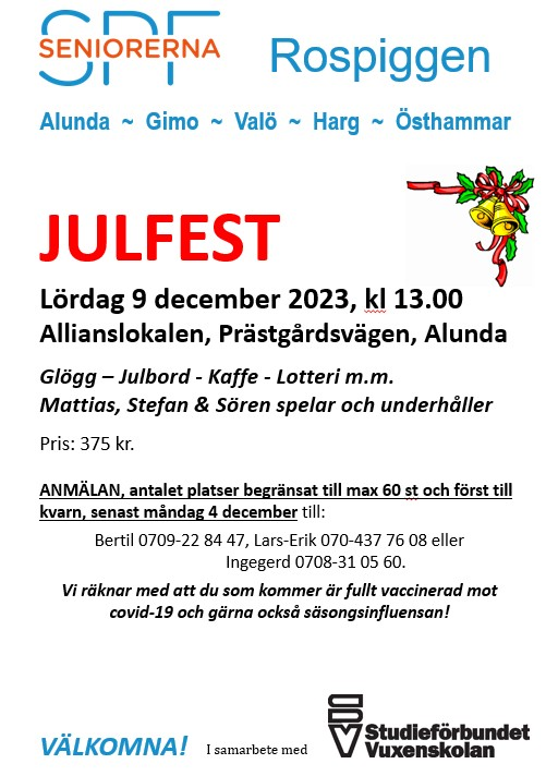 Välkomna till SPF:s julfest i Allianslokalen, Alunda.