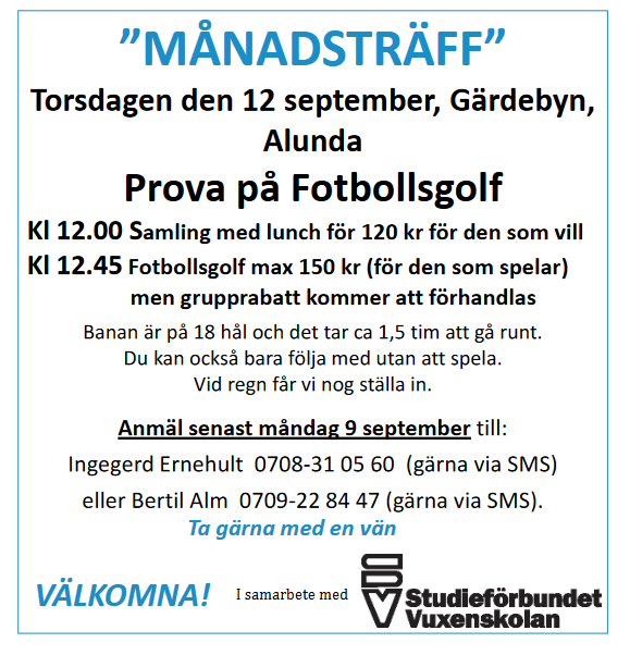 Månadsträff med fotbollsgolf i Alunda den 12 september.
