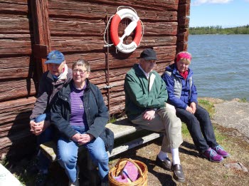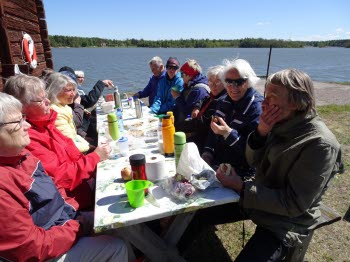 När vi synat av blombestånden smakade det gott med korv och fika nere vid Kallrigafjärden. Vi satt i lä vid det gamla magasinet vid kommunens camping- och båtplatser. I år smakade Lars-Eriks nygrillade korvar extra gott!
