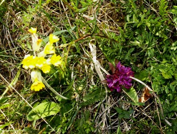 15 st väl påklädda Rospiggar traskade fram bland blommorna. Några få Adam och Eva hade hunnit komma upp, Getrams, Rödblära, Tjärblomster, Humleblomster och rikligt med Gullvivor och Tvåblad fanns också att beskåda.