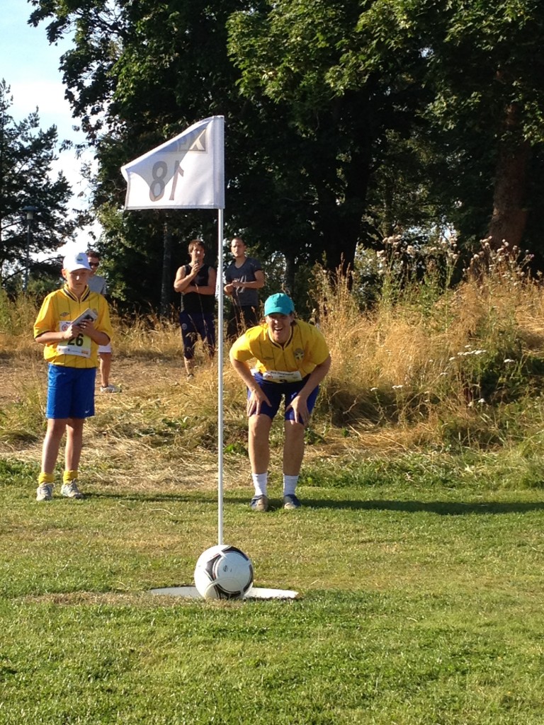 Efter en kort introduktion av superduktiga golfaren Julia kunde vi sätta igång. Uppdelade i 4 lag började vi sparka oss runt banan.Upp och ner gick banan över stock och sten fram till greenen och hålet. Svårt - men väldigt roligt! Alla kunde vara med - man behövde inte ha varit fpotbollsspelare.