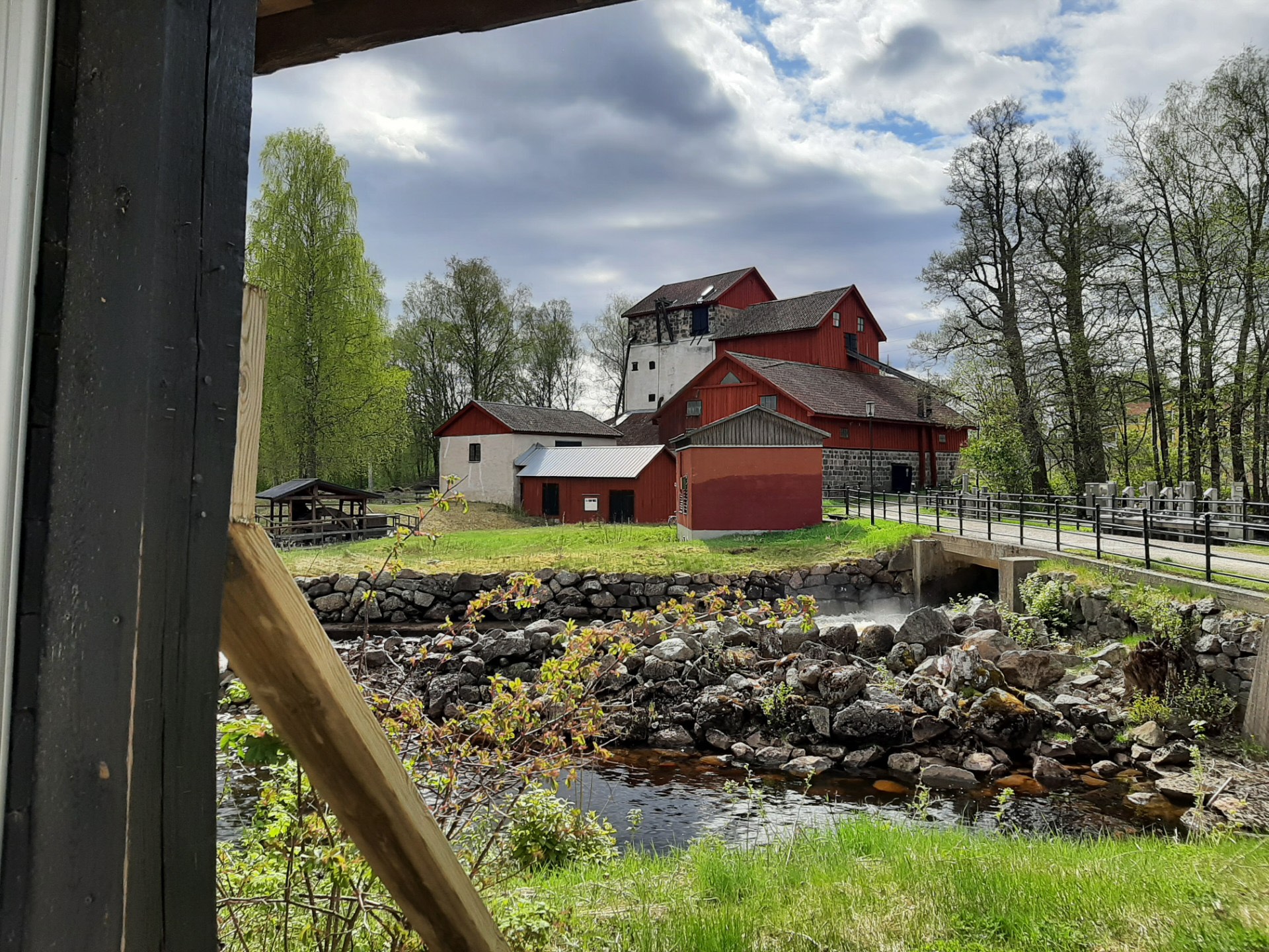 Eftersom vi var så många så delas vi upp i två grupper. Axel Fonander och Per-Åke Pettersson guidade varsin grupp. Vår grupp gick med Per-Åke och vi började med att ta en titt på vattenhjulet som hade tillverkats av "Järngänget" efter att den gamla stampen kraftigt förfallit. De hade gjort en så exakt kopia som möjligt. Det tog tre år att bygga den. Den drev Slagstampen, som krossade både slagg och malm.