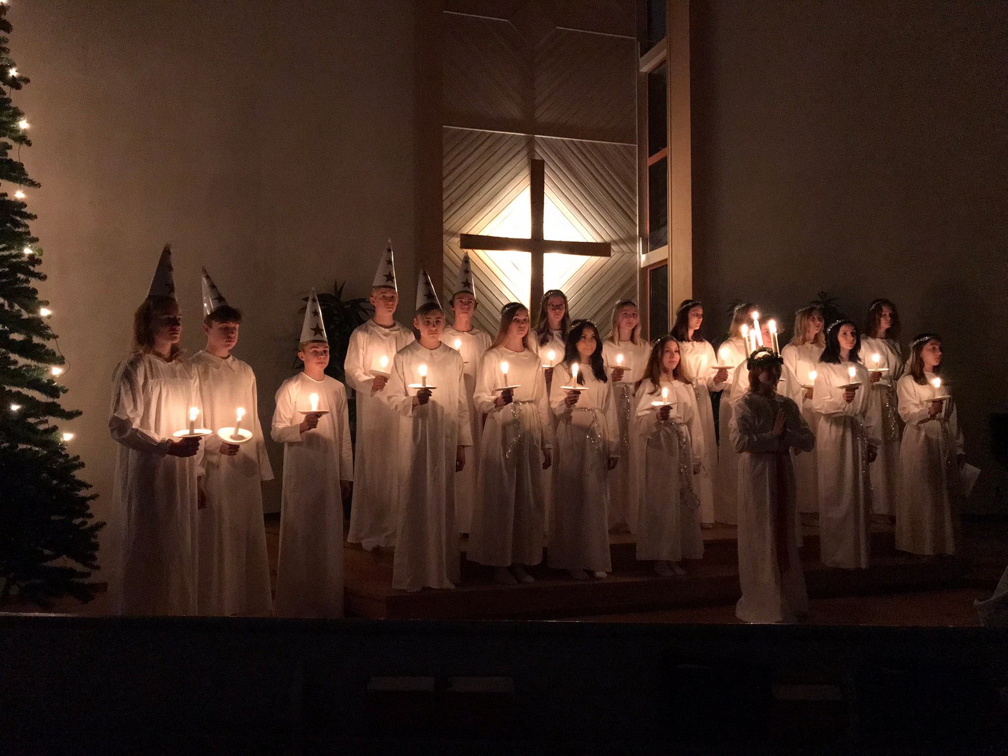 I kyrksalen njuter vi av luciatåget och bjuds på stämningsfulla julsånger!