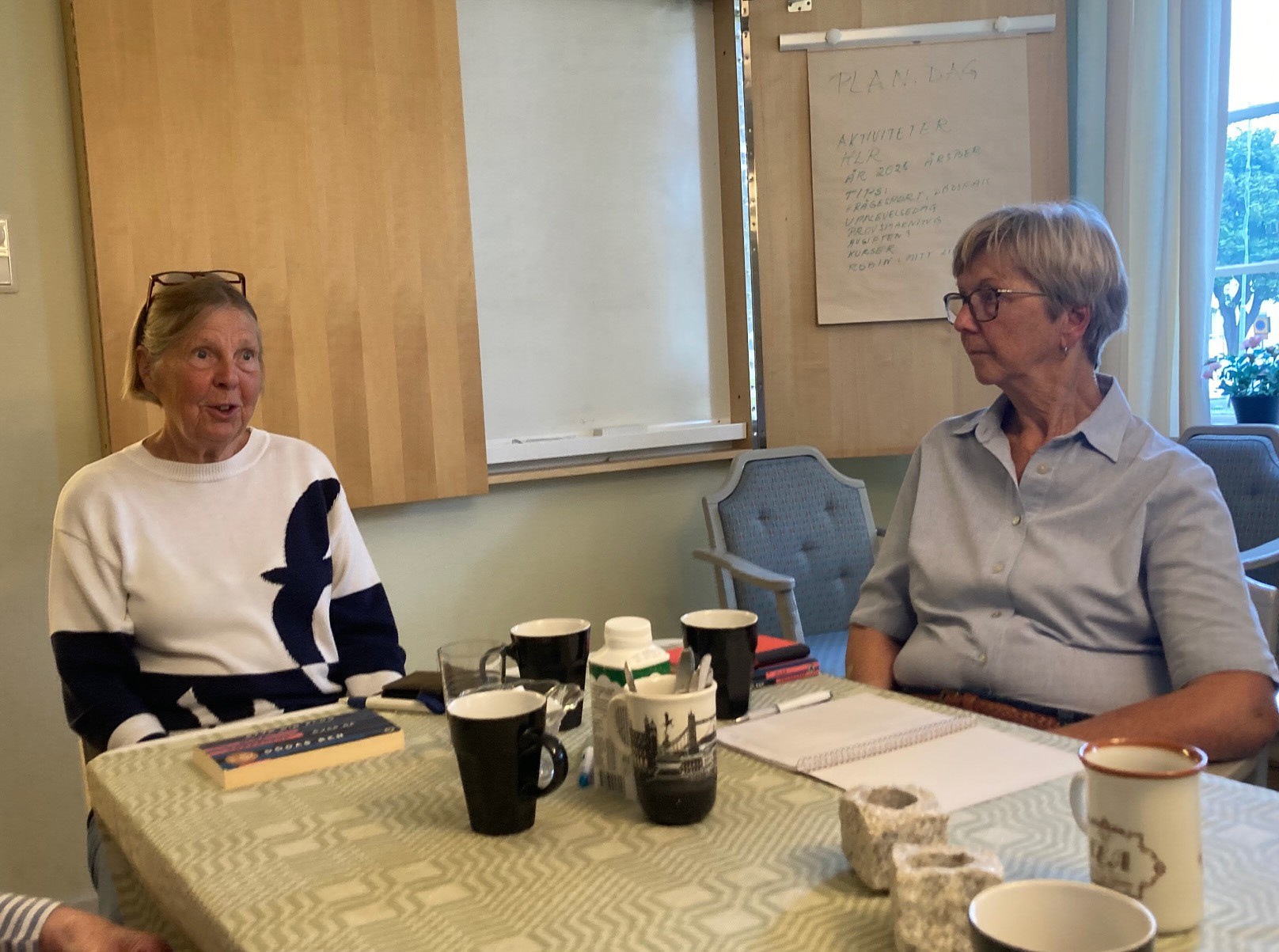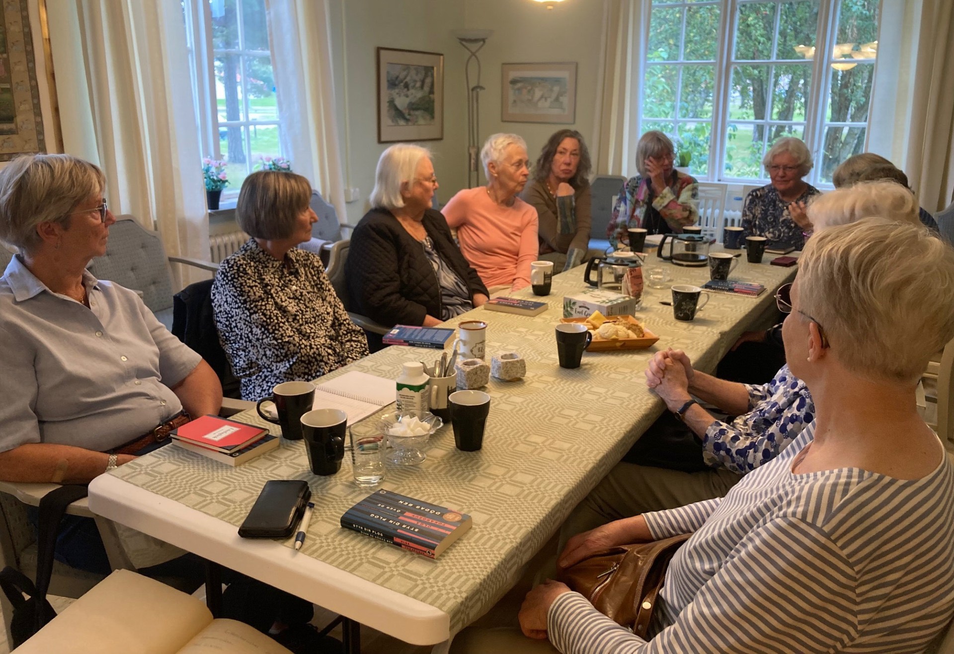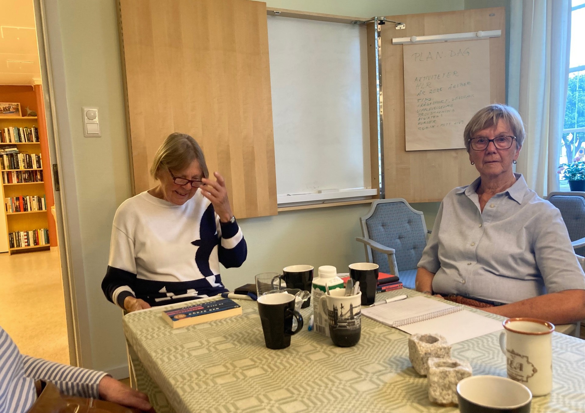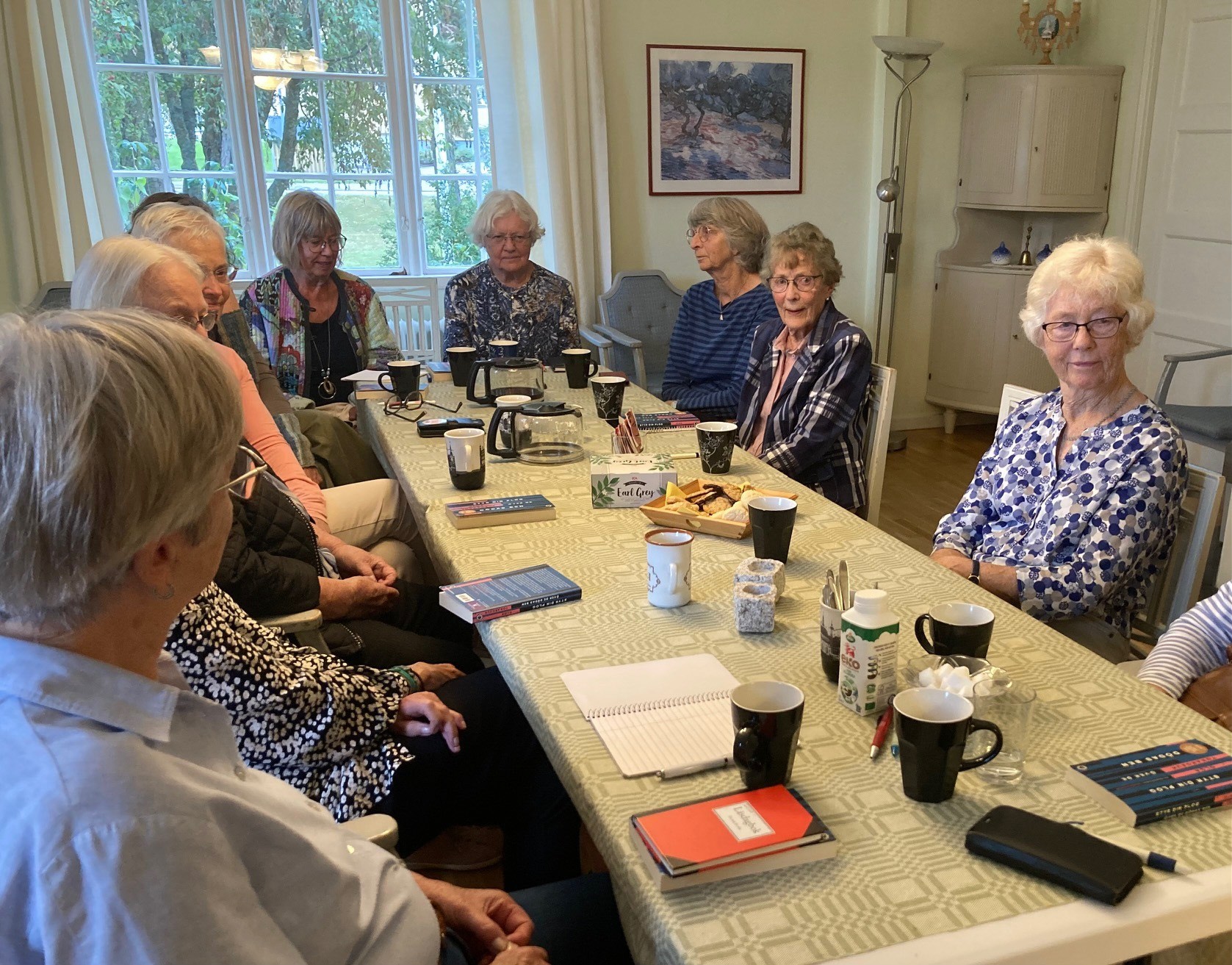Först gick vi laget runt och presenterade oss för varann, tipsade om tidigare trevliga läsupplevelser och fikade. Margareta presenterade sedan vår första bok "Styr din plog över de dödas ben" av tidigare Nobelprisvinnande författaren Olga Tokarczuk. Boken kom från en färdig "bokkasse", avsedd för bokcirklar, på biblioteket. Några kände väl till den sedan tidigare, medan både den och författaren var helt nya för andra i gruppen. Till nästa tillfälle, som är den 23 september, kommer vi förhoppningsvis alla att ha läst den och då kommer vi att dela med oss av våra läsupplevelser, innan vi kastar oss över nästa gemensamma bok. Det var en mycket trevlig eftermiddag på Clevegården.
