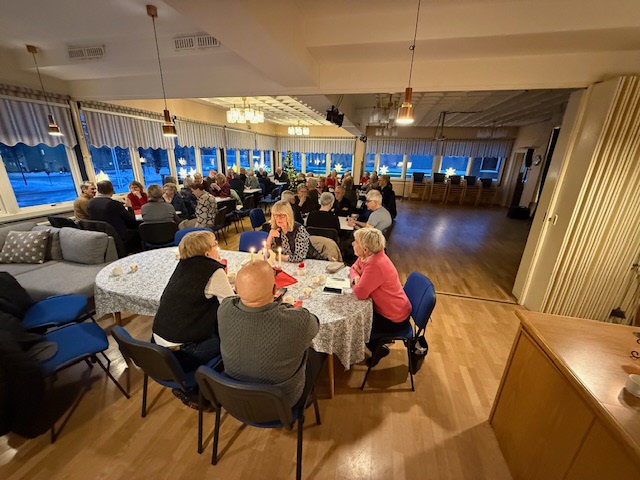 SPF Seniorerna Guldstaden bjöd in till 2025 års Julfest på Din Fest på Campus. Många var de medlemmar som ville vara med denna eftermiddag för att få försmak av julen. När alla funnit en plats, släcktes ljuset ner och ljudet från Luciasången ljöd genom lokalen. Vi fick njuta av Skelleftebygdens Lucior även detta år, ett luciatåg, som under ledning av Vilma Andersson sjöng blandade kända sånger med fraser som " Santa Lucia", Vi hälsar dig Lucia", "Dom Dom Lucia Dom Dom ", "Vi önskar er en fröjdefull jul". Lions i samarbete med Norran är de som organiserat detta och överskottet går till insamling för cancerforskning i norra Sverige. Efter denna mysiga inledning, var vi många som blickade mot det framdukade julbordet av Din Fest på Campus. En julfest utan julmat förväntar sig ingen. Nu tog Nils fram sin mugg för bordsdragning. Alltid lika spännande om det är mitt bord som får gå. Väldigt hög stämning rådde runt borden, god gemenskap och samvaro. Det var mycket "opratat". GOD JUL önskade vi varandra, innan det var dags att gå hem.
