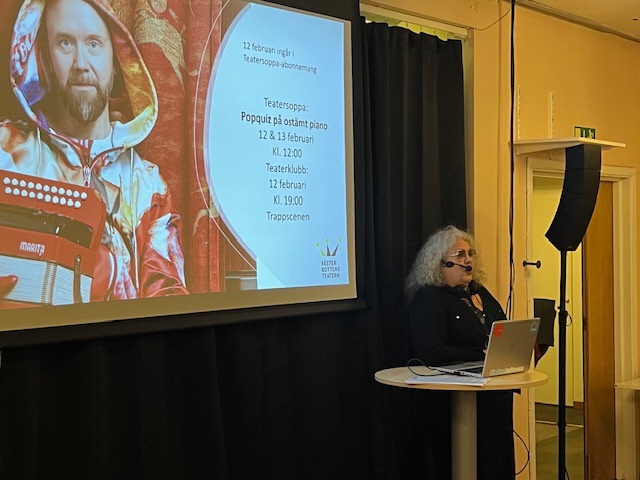 Först ut var som vanligt Mia Asserud, som presenterade Västerbottensteaterns spännande, imponerande och intressanta program för våren. Vårens 2 olika abonnemang, Teatersoppa och Teater och omfattar 4 föreställningar vardera för 1000 kr/4 föreställningar.