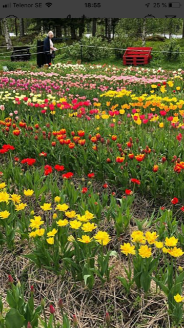 Jätte trevlig dag med guidning och fått höra hur man får vackra tulpaner att leva år från år. Bra tips också. Kupa med sandig jord gärna med lite benmjöl i jorden som näring. Blanda hår i jorden så håller sig sork och rådjur borta. Fråga frissan om hon har lite hår hon kan avvara. Fårull eller pressa en vitlök på en pinne går också bra.