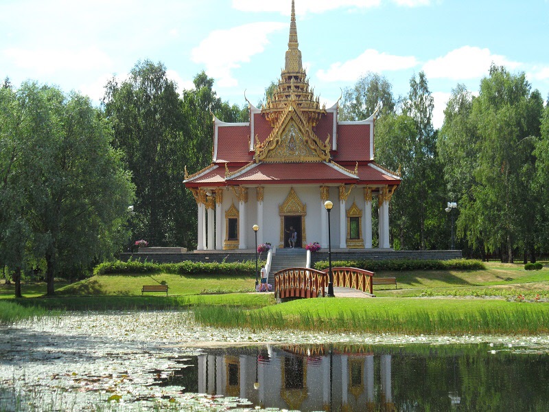 Dagens andra besöksmål var Thailändska paviljongen i Utanede. Där fick man bakgrunden till den guldskimrande byggnaden berättad av guiden Robert Falk.