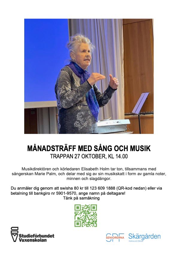 Vi träffs på Trappan för höstens andra månadsträff måndag 27 oktober kl 14.00. Musikdirektören och körledaren Elisabeth Holm tar ton, tillsammans med sångerskan Marie Palm, och delar med sig av sin musikskatt i form av gamla noter, minnen och slagdängor.