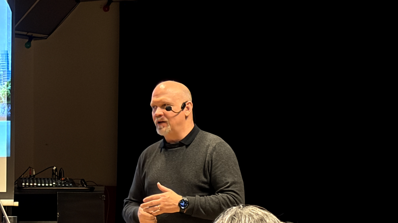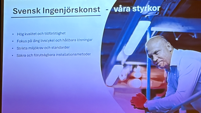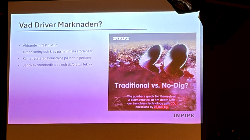Niklas berättade om företagets verksamhet, som går ut på att renovera ledningar och kulvertar utan att behöva gräva upp marken. Arbetet kan i stället utföras direkt från brunnslocket, innebär både smidigare och mer hållbara lösningar.