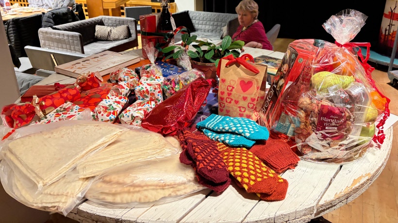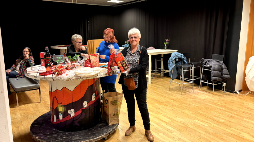I år var vinstbordet extra generöst: förutom julkorgen fanns vackert mönstrade vantar, tunnbröd och många inslagna julklappar. Lite tunnbröd såldes även efter att ordföranden avrundat med ett varmt ”God jul till alla!”.
