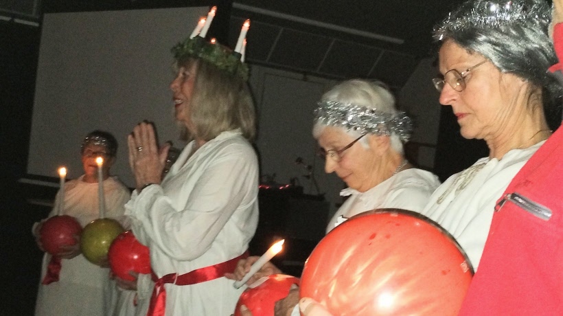 Ordförande Lars Ekbäck hälsade alla välkomna och därefter släcktes ljuset i lokalen. Snart hördes den välbekanta sången ”Natten går tunga fjät…” ute i korridoren, och in trädde Lucia med sina tärnor och en tomte.
