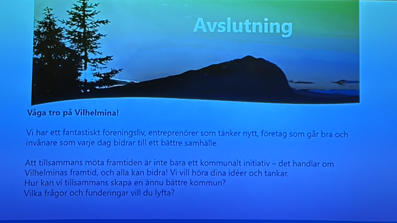 Christer inledde med orden ”Inget blir som förr” och beskrev hur kommunen står inför ekonomiska utmaningar till följd av minskande befolkning. Minskningen beror inte på utflyttningen, då antalet inflyttade i stort är detsamma som utflyttade, utan på att antalet födda är färre än antalet avlidna. En minskande befolkning leder till minskade statsbidrag, vilket i sin tur kräver anpassningar i kommunens verksamhet, Samtidigt betonade Christer vikten av att de som bor här ska ha det bra och uppmanade till ett positivt förhållningssätt. Vilhelmina är en fin ort, framhöll han och lyfter bland annat att kommunen vunnit utmärkelsen Bästa tillväxt 2025 i Västerbottens län, vilket innebär att kommunen hade störst andel företag med ökad omsättning, nyanställningar och vinst.