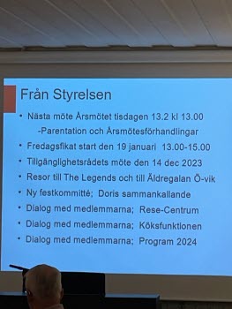 Under fikapausen tog styrelsens medlemmar tillfället i akt att få in nya krafter till att engagera sig i bevakningen av resecentrat, bemanningen av köket samt få synpunkter på program för 2024.