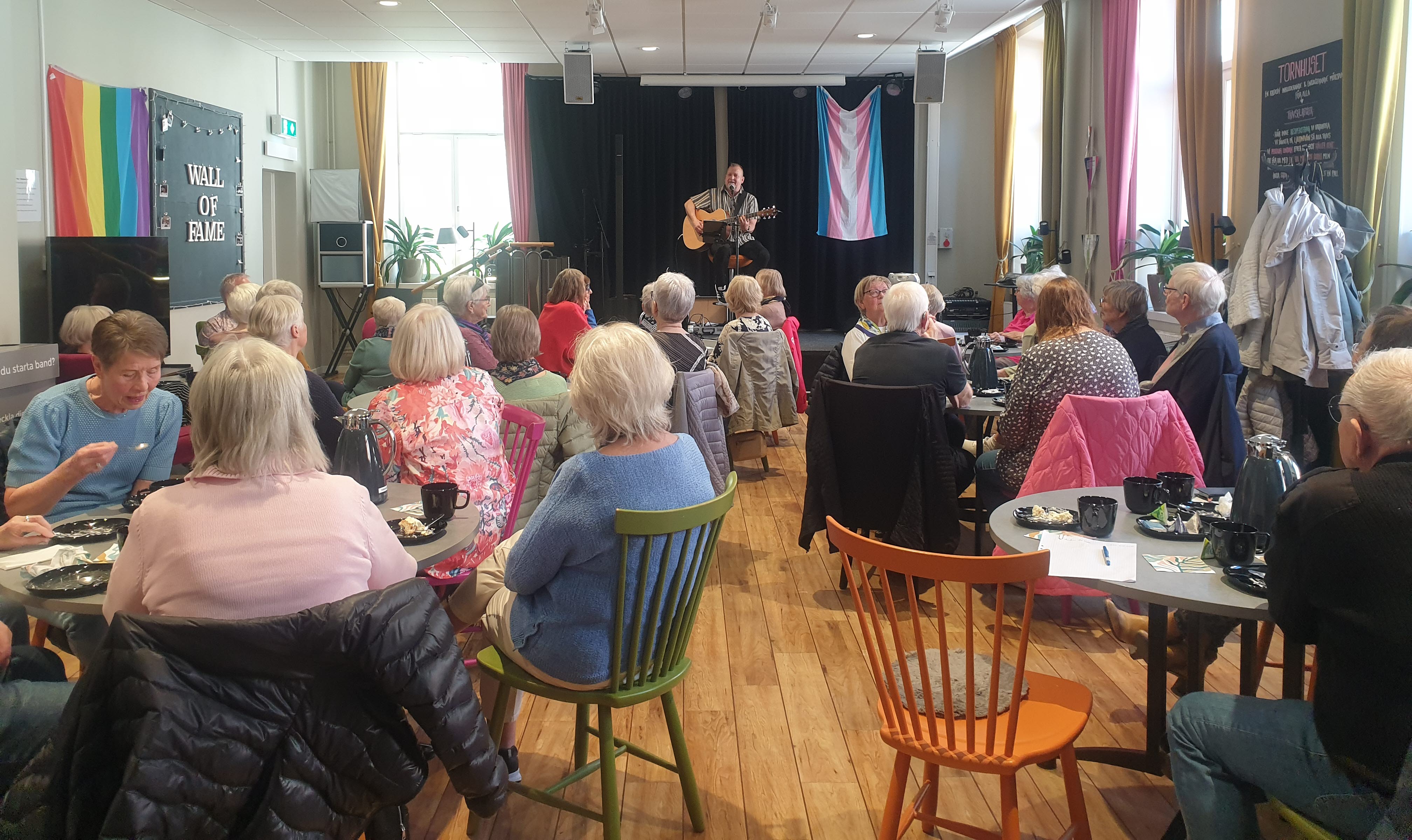 En trevlig eftermiddag med Jordgubbstårtor och underhållning av Arve Solli som sjöng och spelade gitarr. Drygt 30 personer fick önska låtar/visor och det blev t.o.m lite allsång.