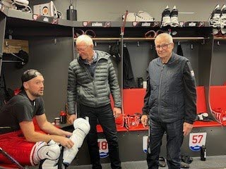 Kjell-Åke Tjernström tog som alltid väl hand om oss och gav en mycket fin information om Timrå IK:s historia, hur framgångarna en gång började fram till idag då de nu är ett etablerat lag i SHL. Annelie Nordin gav också en mycket fin information om Timrå IK:s Teamsters, vilket kan ses som en god investering för framtiden genom att skapa förutsättningar för barn och unga att växa och inspireras av goda förebilder. Därefter var det då äntligen dags att se laget på is då de har sin tisdagsträning, först målvakterna sen spelarna. Ett besök hanns också med till de nya logerna, gymmet och omklädningsrummet där några av oss fick en liten pratstund med Tim Eriksson.