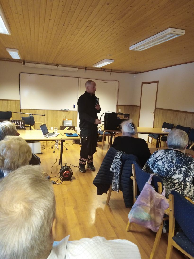 Han fick omgående ordet och informerade på ett väldigt förståeligt sätt om organisationens uppbyggnad och dess uppdrag. Från bränder till drunkningstillbud och oljesanering. Han påpekade behovet av brandsäkerheten med bl.a. brandvarnare, gärna flera i boendet. Byt batteri. Timer till elspisen. Om det brinner, tillgång till pulversläckare. Stäng in branden, Annan värdefull kunskap delgavs oss.