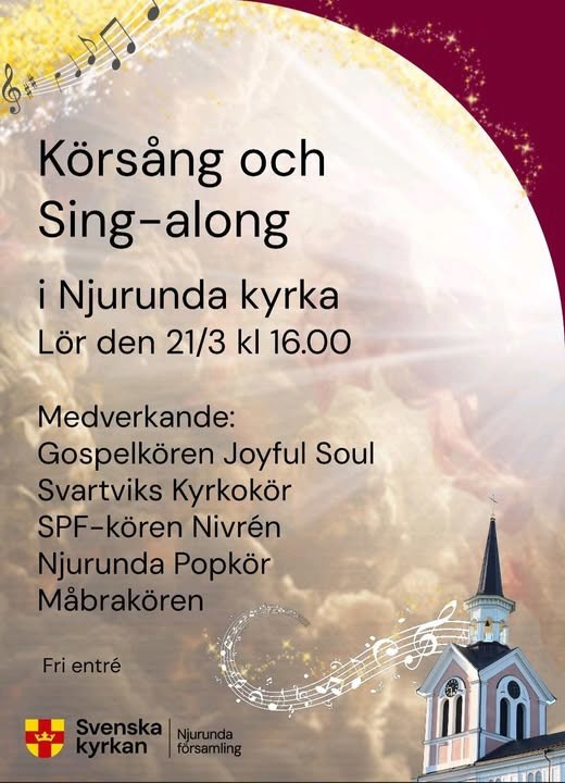 På lördagseftermiddag fylldes Njurunda kyrka av en härlig sångarglädje när fem körer samlades. Det var Joyful Soul, Må bra-kören, Svartviks kyrkokör, Njurunda Popkör och SPF-kören Nivrén. Det bjöds på en blandad repertoar, som Stad i ljus, Fattig bonddräng, A'int she sweet o Jag är jag. Publiken fick också sjunga med i allsånger som varje kör presenterade.