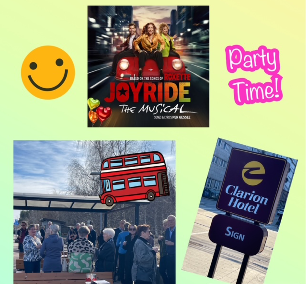 En fredagsmorgon åkte ett gäng glada medlemmar till Stockholm för att se JOYRIDE på China Teatern. Som vanligt blev det lunchstop på Tönnebro och lite ”gofika” på Torsberget. Incheckning på hotell Clarion för ombyte till kvällens föreställning på China teatern. En god trerättersmiddag serverades på restaurang Funkalistic där vi skymtade Tom Sjöstedt bland matgästerna. Vidare transport med bussen till teatern där vi fick njuta av musikalen JOYRIDE och sedan vidare till hotellet där många fortsatte kvällen för att umgås i baren. Lördagen spenderades med egen tid för shopping, lunch eller bara att sitta och njuta ute i solen innan det var dags för hemfärd. En trevlig ”tripp” med god stämning.