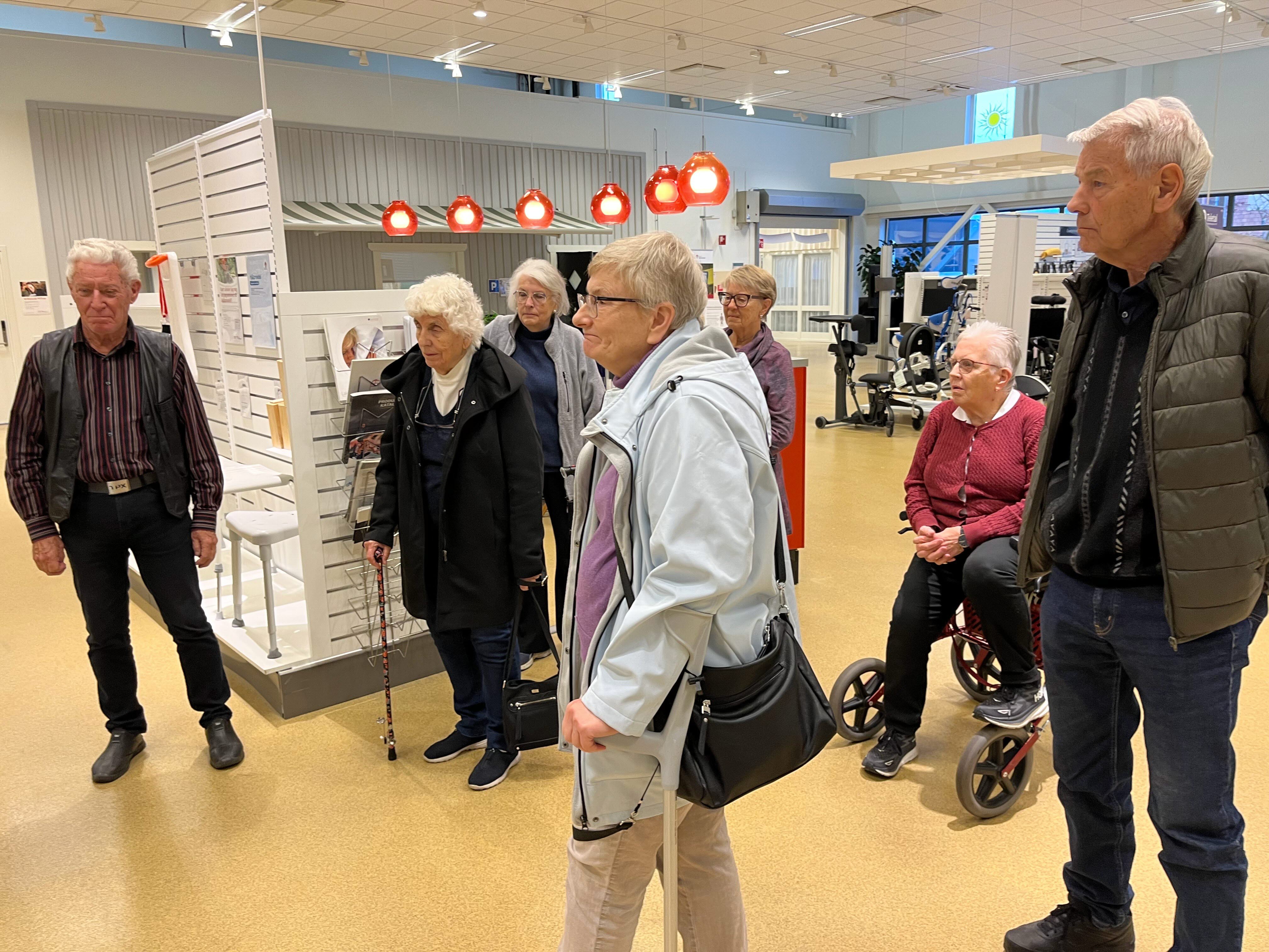 Nio tappra deltagare tog sig via buss till hjälpmeddelscentrum på Hässlö där vi fick en presentation av Frida Foborg om vilka hjälpmedel man kan få. Efter det blev det en rundvandring guidad av Maja Simonsson.