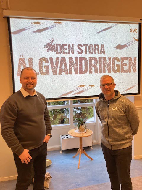 Ingen kan väl ha undgått att höra talas om Den stora älgvandringen – SVT´s ”slow-tv” om älgarna som simmar över Ångermanälven för att ta sig till energirika sommarbeten i fjällnaturen?! Projektet startade år 2019 och går nu in på sin åttonde säsong. Projektledare Johan Erhag och producent Stefan Edlund hade rest hela vägen från Umeå och stod nu beredda att berätta för Kungsörs SPF om hur det hela startade. Vår ordförande Olle Hult hälsade alla välkomna och lämnade snabbt över ordet till våra gäster. Så, hur startade det? När Johan och Stefan arbetade på SVTs Naturredaktionen med programmet ”Mitt i naturen”, kom de i kontakt med norsk TV som gjort en ”langsam-tv produktion” på Fågelön. Då kläcktes idén att göra något liknande i Sverige och genom kontakter och lokalkännedom hittade man lämpliga platser att försöka filma älgvandringen på. Att ligga och smyga i en buske och försöka filma älgarna gick inte så bra, utan här krävdes fjärrstyrda kameror. Tekniken har utvecklats och förbättrats under åren, från de otympliga batteridrivna kameraarrangemangen till dagens tekniska lösningar. Idag sitter producenten i Umeå, 23 mil från Junsele där filmningen sker. En imponerande mängd kablar, (22 000 meter!), 35 kameror och många mikrofoner finns i naturen. Man samarbetar med SLU för att få rätt kunskaper om älgar och för att göra rätt om situationer uppstår. Det var ett mycket trivsamt och underhållande föredrag!