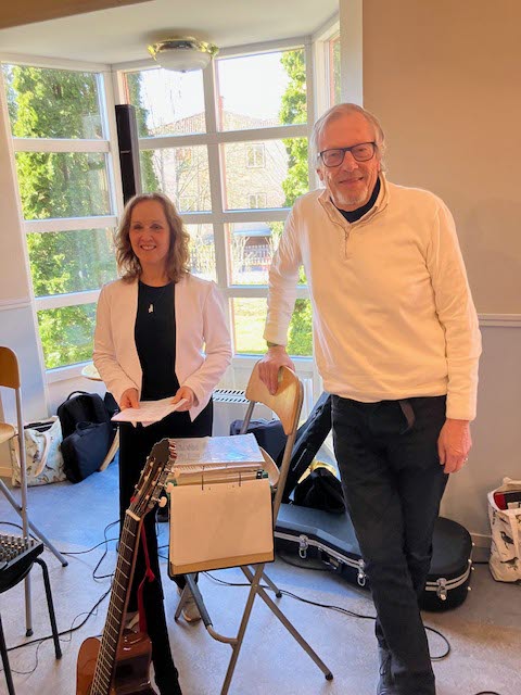 Då vi ätit färdigt och kört en snabb avdukning, hälsades dagens underhållare varmt välkomna. Göran Bjarnegård och Carina Johansson bildar duon ”Pastorn och Dödgrävar´n”. Göran spelade gitarr och de sjöng finstämt tillsammans. Många sånger sjöngs med ”glimten i ögat”. De hade skojat till texterna på en del kända låtar. Det var, som exempel, en del Povel Ramel men också Magnus och Brasse, Towa Carsson och Håkan Hellström. Det blev också lite allsång med klurig text. Carina och Göran sjöng fint, spred glädje och fick varma applåder och varsin vårbukett..