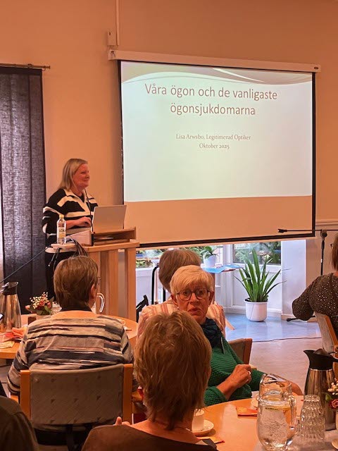 Dagens föreläsning om ”Våra ögon och de vanligaste ögonsjukdomarna” lockade ett 60-tal medlemmar. Ordförande Olle Hult hälsade oss och vår föreläsare optikern Lisa Arwsbo välkomna. Lisa fick ordet direkt och berättade till att börja med lite kort om sin utbildning till leg optiker och hur hon arbetat många år som optiker i butik. Sedan fem år tillbaka arbetar Lisa på ögonmottagningen i Västerås. ”Att det finns så mycket i ett öga” var det nog flera som tänkte då vi fick se många detaljerade bilder på ögon och ögonsjukdomar. Det var en mycket intressant föreläsning av en mycket kunnig optiker som dessutom var behaglig att lyssna till. Det som framgick tydligast var att den största risken rent allmänt för att få dålig syn är åldern. Vi behöver mycket ljus då pupillstorleken minskar, vi får sämre mörkerseende, vi kan få torra ögon och dessutom drabbas av olika sjukdomar. Med mera, med mera! Lisa fick sedan svara på några frågor från publiken och med en varm applåd och en vacker orkidé tackade vi Lisa för hennes medverkan.