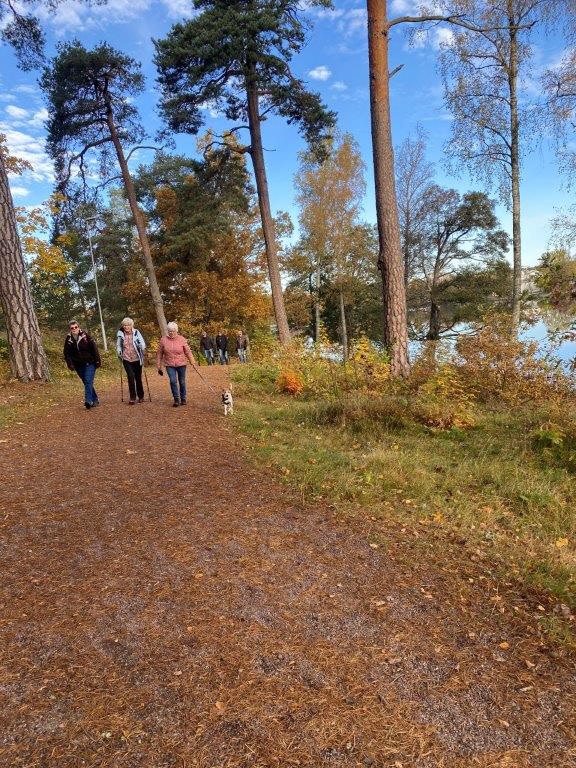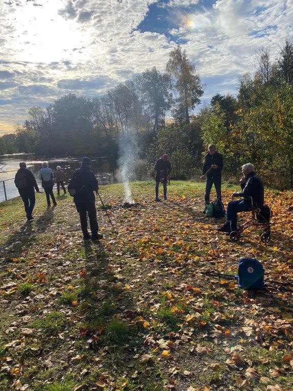 När eldaren med medhjälpare, som valde en närmare väg, anlände till platsen visade det sig att grillplatsen inte längre fanns, dvs platsen fanns förstås men ingen grill och inga sittplatser. Några hundförsedda damer upplyste om att någon bränt ner anläggningen för ett antal år sedan. Nåväl, kolrester på marken vittnade om att andra gjort samma upptäckt före oss, så vi anammade deras idé och lyckades få till en grillbrasa som välkomnade gruppen efter deras 3 km långa vandring. Korv och kaffe intogs sittande på marken vid åkanten och alla visade därvid upp en smidighet som skulle göra många äldre (och yngre) gröna av avund. Att sedan eldaren glömt sina korvar hemma gjorde inte saken mindre minnesvärd denna soliga vackra höstdag.