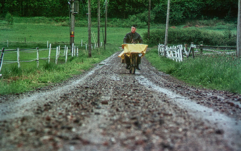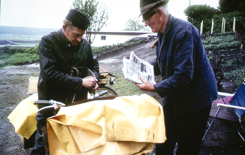 För många i området var brevbäraren det enda besöket dom fick. Vissa stod vid brevlådan och väntade, andra hade andra metoder att påkalla hans uppmärksamhet, från en trasa i brevlådan, ett häftstift på lagårdsväggen eller att hissa flaggan. Här uträttar Ivar Andersson ett postärende, kan det vara utbetalning av pensionen.